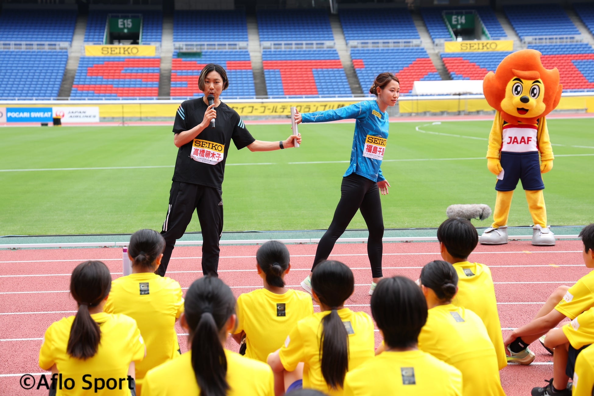 本大会の午前中に、昨年に引き続き“セイコーわくわくスポーツ教室”を開催します。セイコースマイルアンバサダーの福島千里さんをメイン講師に、日頃より陸上に取り組む小学生の4×100mリレー(男女混合)を実施いたします。3名のレジェンドアスリートもお招きし、福島さんと一緒にバトンパスのコツの伝授やリレーのデモンストレーション等を行っていただきます。