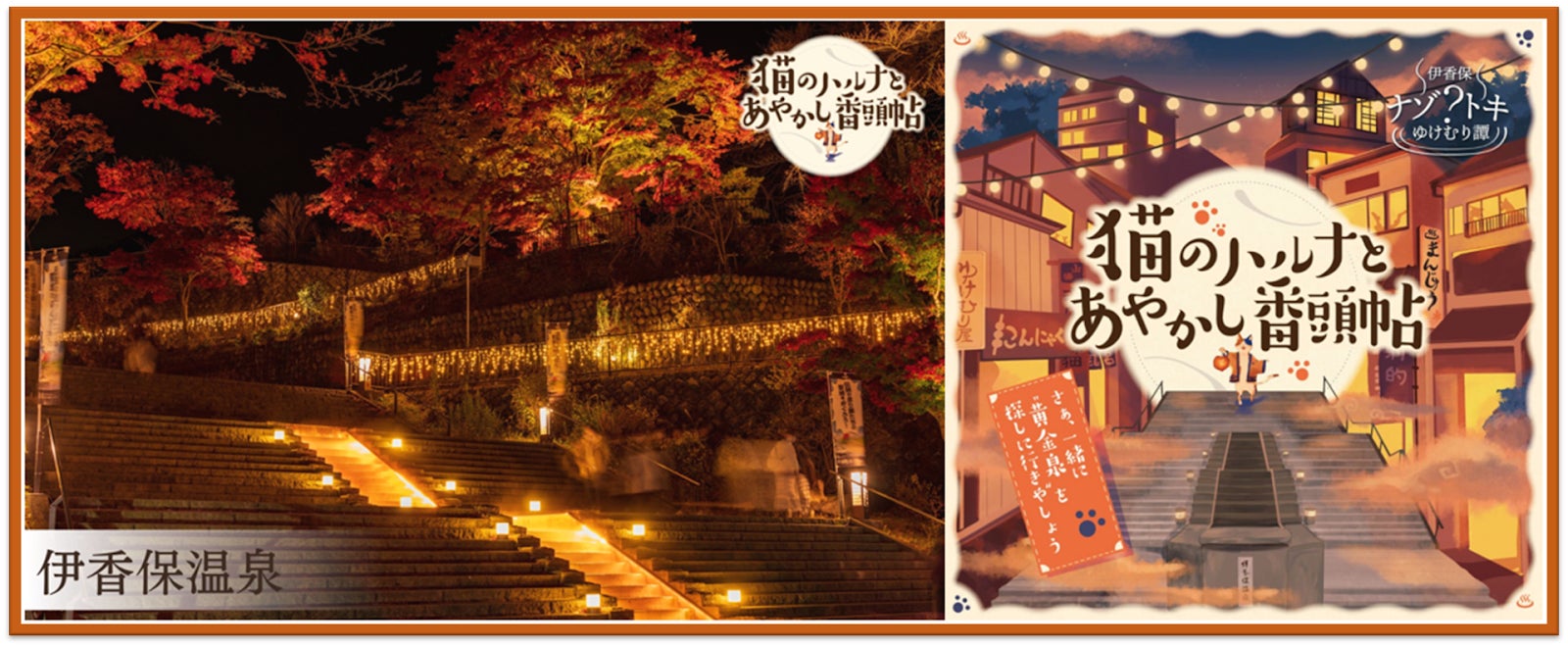 この物語は猫と温泉が好きな女の子「カホ」が体験する不思議で怪しい物語。伊香保温泉を周遊しながら紅葉をお楽しみいただけます。ここでしか味わうことができない、没入できる謎解き体験をご提供いたします。
