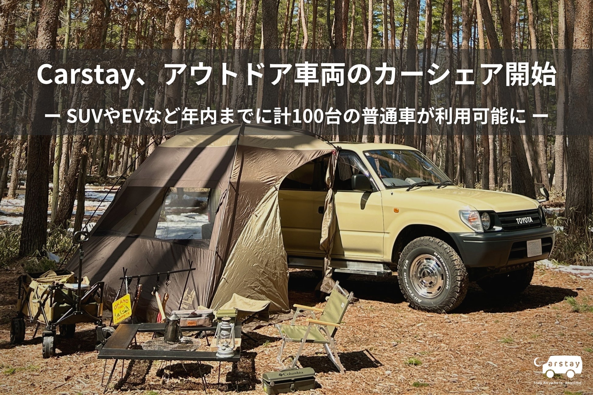 キャンピングカーと車中泊スポットのシェアリングサービス、車両製造、改装支援など国内最大級のバンライフのプラットフォーム事業を展開するCarstay(カーステイ)株式会社(本社:神奈川県横浜市、代表取締役:宮下晃樹(みやしたこうき))は本日から、大人1人以上が宿泊できるテントの貸出しが可能な普通車※「アウトドアカー」のカーシェアリング・サービスを開始しました。現在、Carstayのサイト上には、トヨタ ランドクルーザー、Jeep ラングラー、ポルシェ カイエン、BYD ATTOなど50台以上の車両が登録され、24時間平均15,000円(税込、保険料・システム利用料別)で利用が可能です。年末年始の大型連休前までにはアウトドアカー100台、1年以内には1,000台以上の登録を目指します。