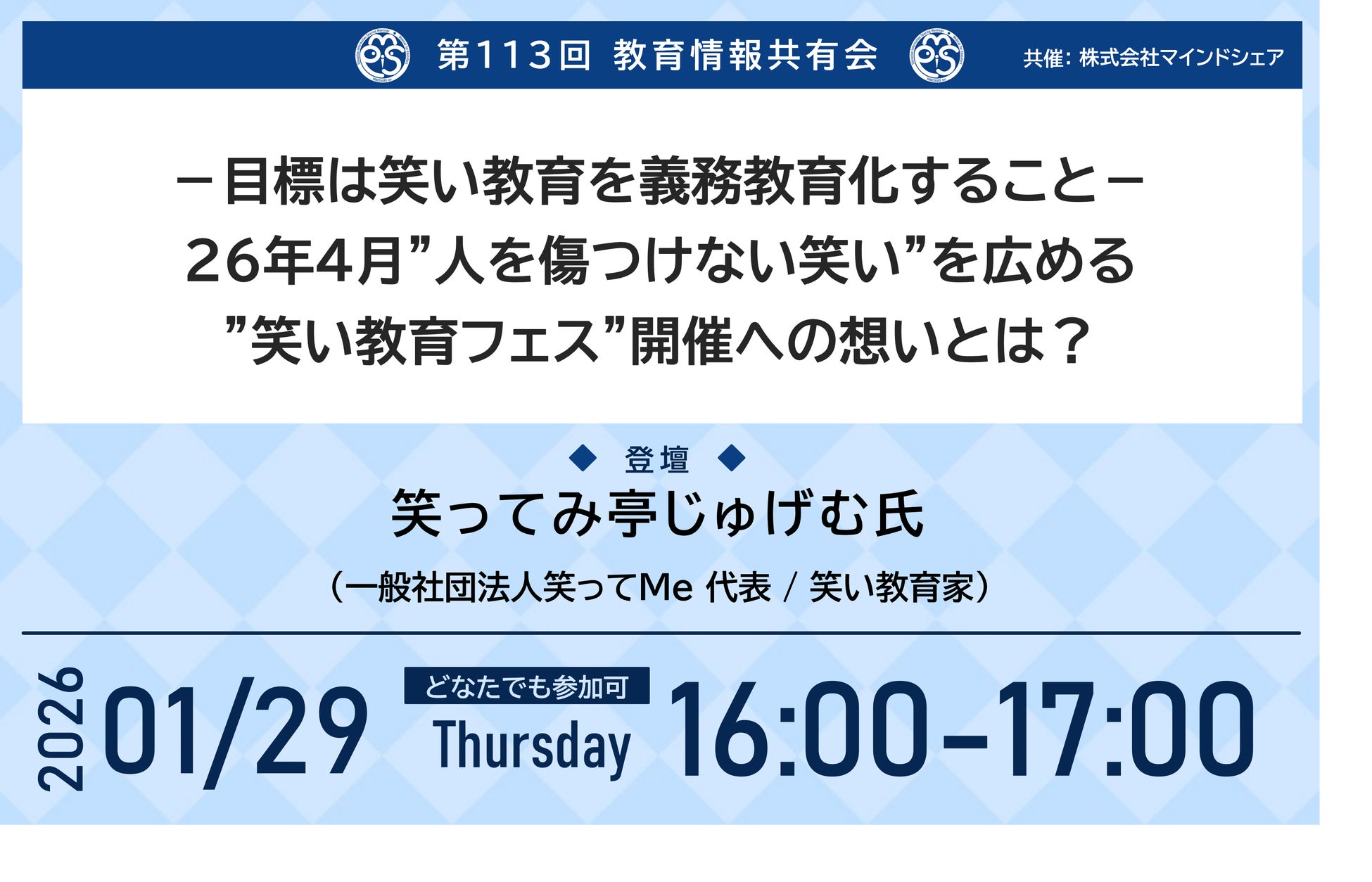 第113回となる今回は「-目標は笑い教育を義務教育化すること-26年4月”人を傷つけない笑い”を広める "笑い教育フェス"開催への想いとは?」をテーマに、笑ってみ亭じゅげむ氏(一般社団法人笑ってMe 代表 / 笑い教育家)よりお話しいただきます。