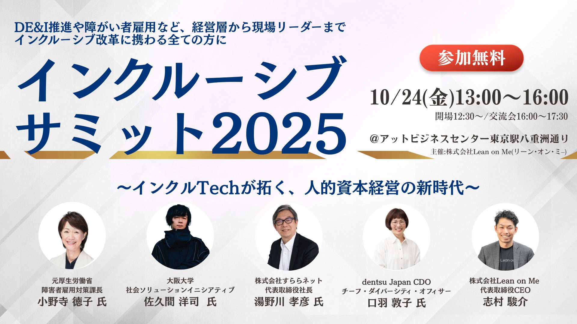 インクルTech※(インクルテック)で社会課題を解決するスタートアップ企業・株式会社Lean on Me(本社:大阪府高槻市、代表取締役:志村駿介、以下「リーンオンミー」)は、2025年10月24日(金)、「インクルTech」を掲げた日本初のサミット「インクルーシブサミット2025 ~インクルTechが拓く、人的資本経営の新時代~」を東京で開催いたします。