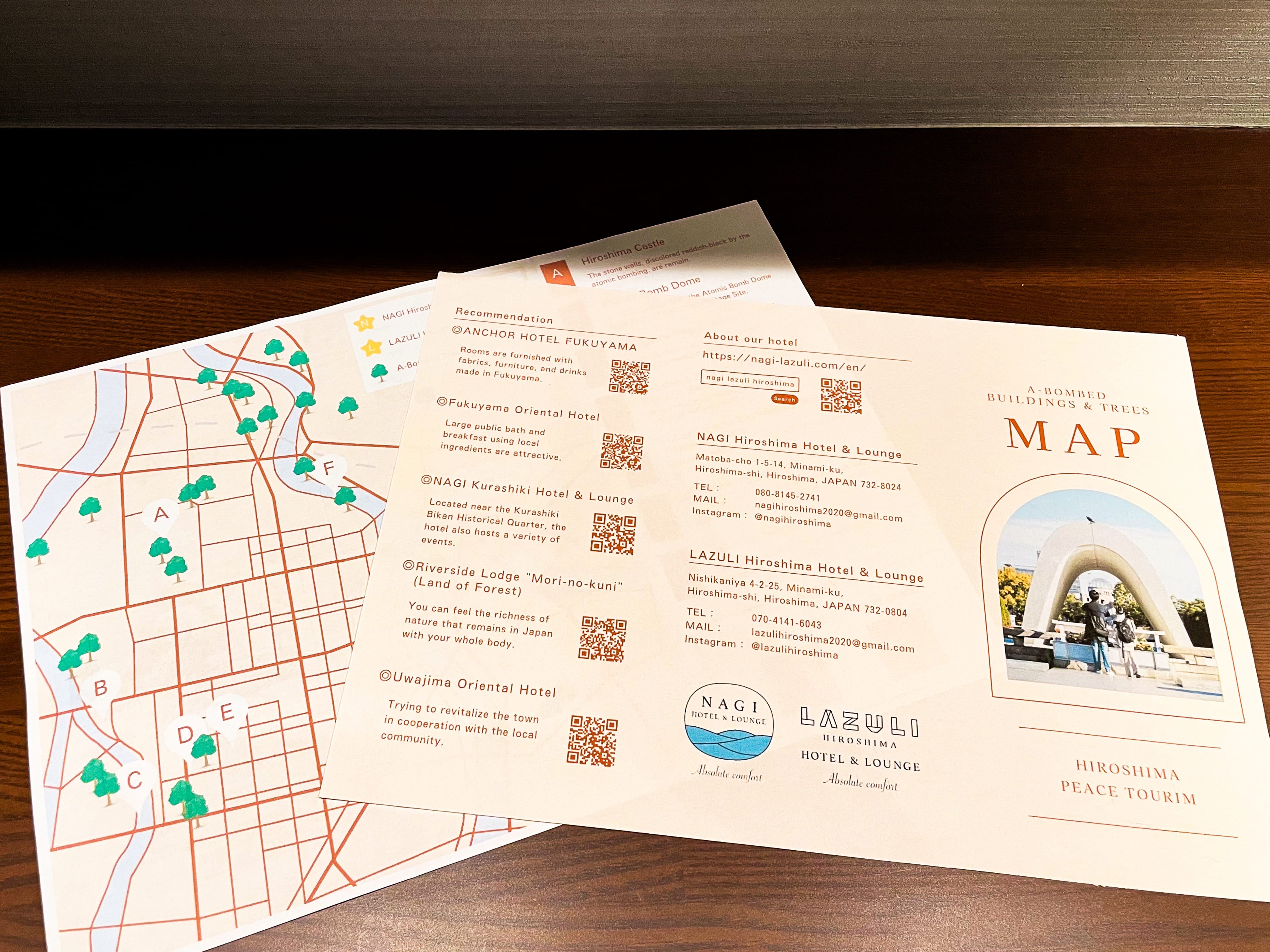 NAGI/LAZULIに宿泊する旅行客、特にインバウンドの方々は原爆ドームや平和資料館へ足を運びます。そこで、せっかくならば展示物だけでなく、街に残っている被爆建造物を知って触れる機会を提案したいと考え企画しました。このマップの案内が広島市内を回る1つのきっかけになり、より広島の魅力に気づいていただけるのではないかと考えています。マップの配布を通して、被爆建造物や樹木を知っていただき、戦争の悲惨さと平和の尊さについて考える機会となること、そして「広島に来て良かった。」と感じていただけることを願っています。