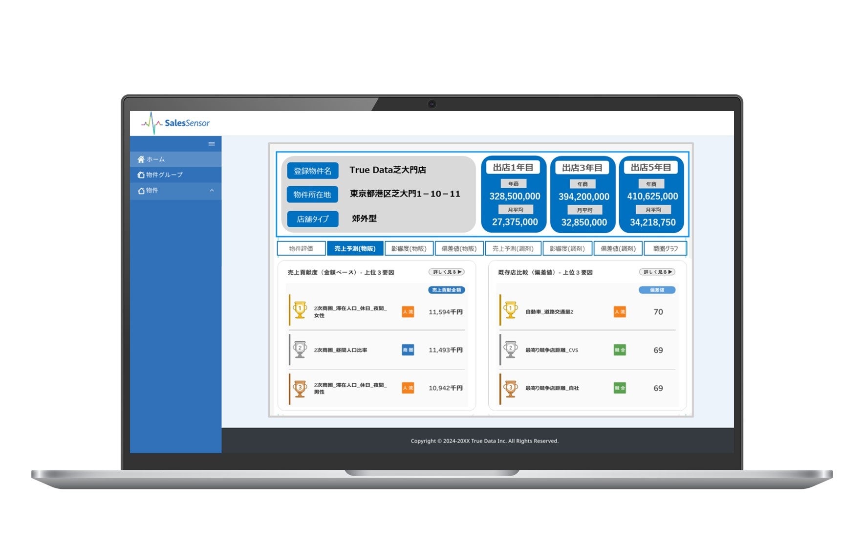 「SalesSensor」はデータマーケティングサービスを提供するTrue Dataが、幅広い業界におけるアルゴリズム構築に強みを持つ株式会社DATAFLUCT(本社:東京都渋谷区、代表取締役CEO:久米村 隼人、URL:https://datafluct.com/、以下DATAFLUCT)と連携して提供する小売業向けの新店売上予測サービスです。小売業が保有する店舗売上実績データや店舗設備情報に加え、新店候補物件周辺の商圏、人流、競合店などの外部データをAIが分析し、地域特性を加味した売上予測を自動的に行います。社内にデータサイエンティストがいない小売業でも、高精度な売上予測により、新店売上の最大化と店舗減損の最小化につなげることが可能です。