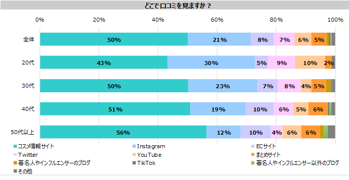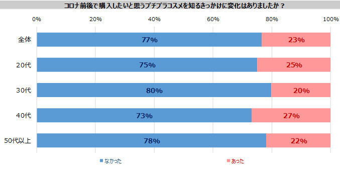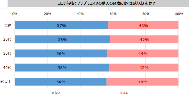 プチプラコスメを購入したことがある方は全体で81%、年代が若くなるにつれて購入率は高くなり20代は92%となっています。購入したいと思うプチプラコスメを知るきっかけは20代から40代はインスタグラムを中心としたSNS、50代以上は店舗でした。購入先は年齢問わずドラッグストアが最も多い結果となりました。コロナ前後で購入頻度の変化は「ある」が43%、「ない」が57%と分かれており、プチプラコスメを知るきっかけや購入場所については大きな変化はないようでした。