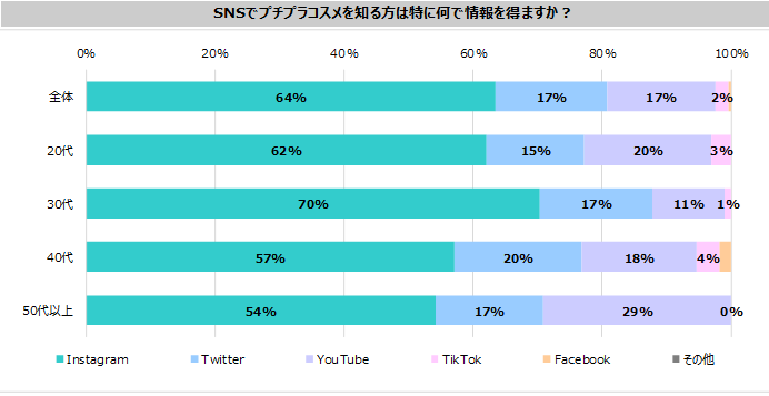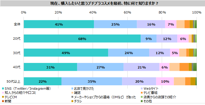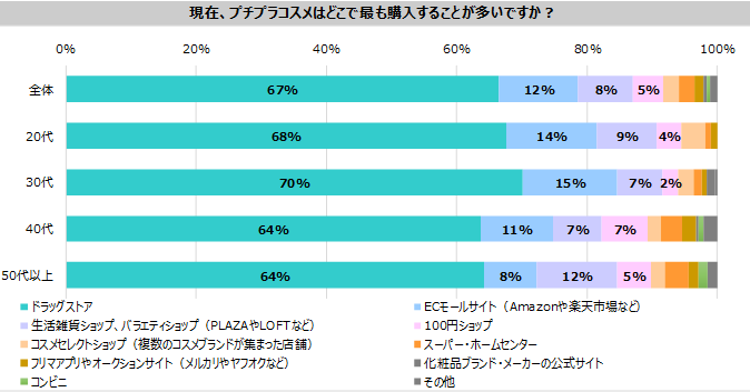 2. プチプラコスメを知るきっかけは20代~40代はSNS、50代以上は店舗。購入先はドラッグストア