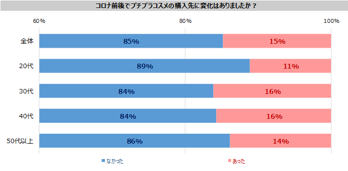 コロナ禍でプチプラコスメを購入頻度に変化があった方のフリーコメントでは「マスク生活によって化粧の頻度が落ち、購入回数が減った」、「巣ごもり生活の中でSNSを見る機会が増え、そこで見たプチプラコスメを買う頻度が増えた」という回答が多くみられました。コロナ前後で購入場所に大きな変化は見られませんでしたが、中には「コロナで遠出を控えるようになってから近所のドラッグストアで手に入るプチプラコスメの購入頻度が高くなった」という声もあり、コロナによって少なくともコスメの消費動向にも影響はあったという結果となりました。