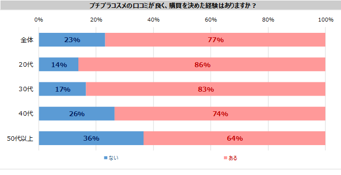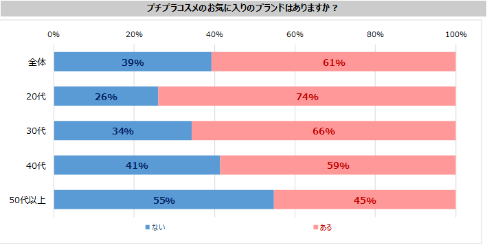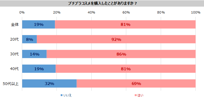 本調査ではこれ以外にプチプラコスメを購入する頻度や許容する金額についてなど全37問で回答を得て、年代別、性別、職業別、既婚・未婚別に集計しています。