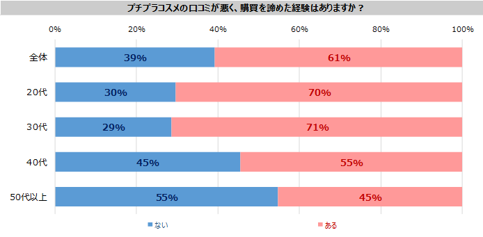 61%の方がお気に入りのプチプラコスメブランドがあり、購入する上で最も重視していることは「機能性」、次に「色味」「価格」でした。口コミをチェックする方は70%と非常に多く、コスメ情報サイトで確認しているようです。良い評価を参考に購入を決めた方は77%、反対に悪い口コミを参考に購入を諦めた方は61%いることがわかりました。