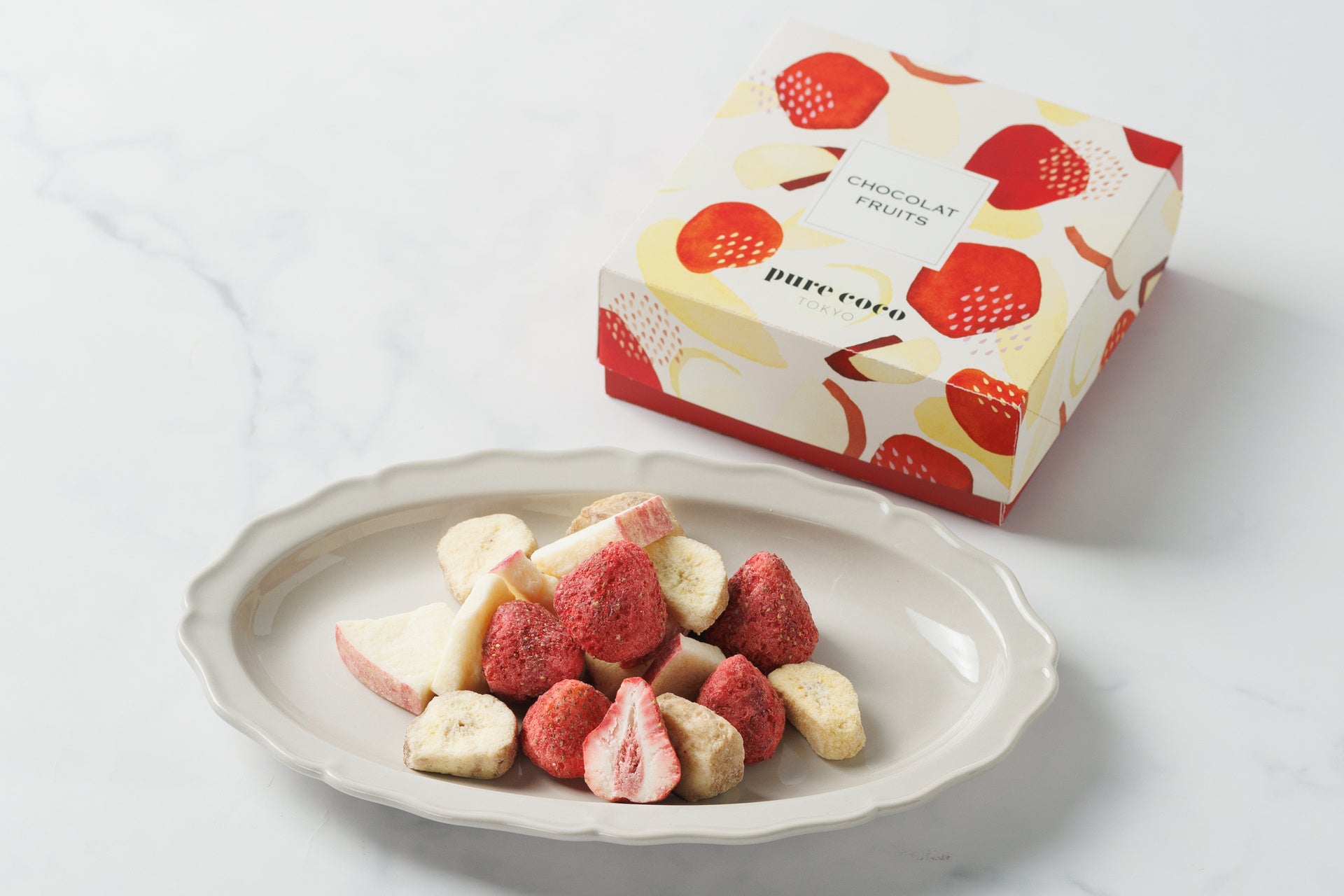 『ピュアココ ショコラフルーツ』は、「いちご」「りんご」「バナナ」の3種のフリーズドライフルーツにホワイトチョコレートを染み込ませ、3種フレーバーを1箱に詰めた商品です。“さくほろ”とした食感とともに、フルーツの味わいとなめらかなホワイトチョコレートの甘さが口の中でひろがる新感覚のチョコレートスイーツです。パッケージには、3種のフレーバーであるフルーツをモチーフにしたイラストが描かれており、シンプルでありながらも可愛らしいデザインです。贈り物や、ちょっといいことがあった時などの自分へのご褒美にもぴったりです