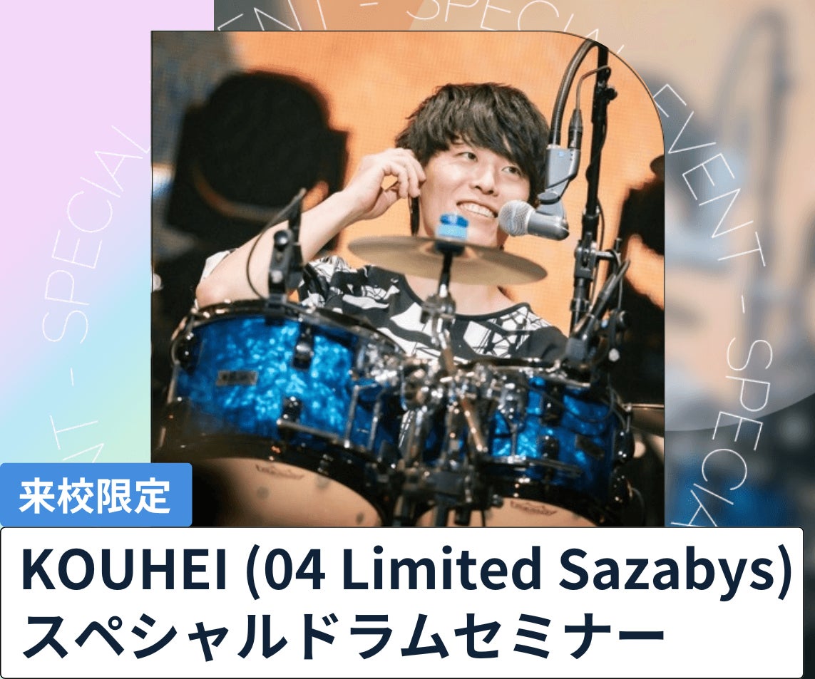 名古屋発の4ピースロックバンド『04 Limited Sazabys』より、ドラマーKOUHEI氏が東京スクールオブミュージック&ダンス専門学校西葛西に来校し、ドラムセミナーを7/26(金)に開催します。一般の方も有料でご参加いただけるお時間もご用意しております。