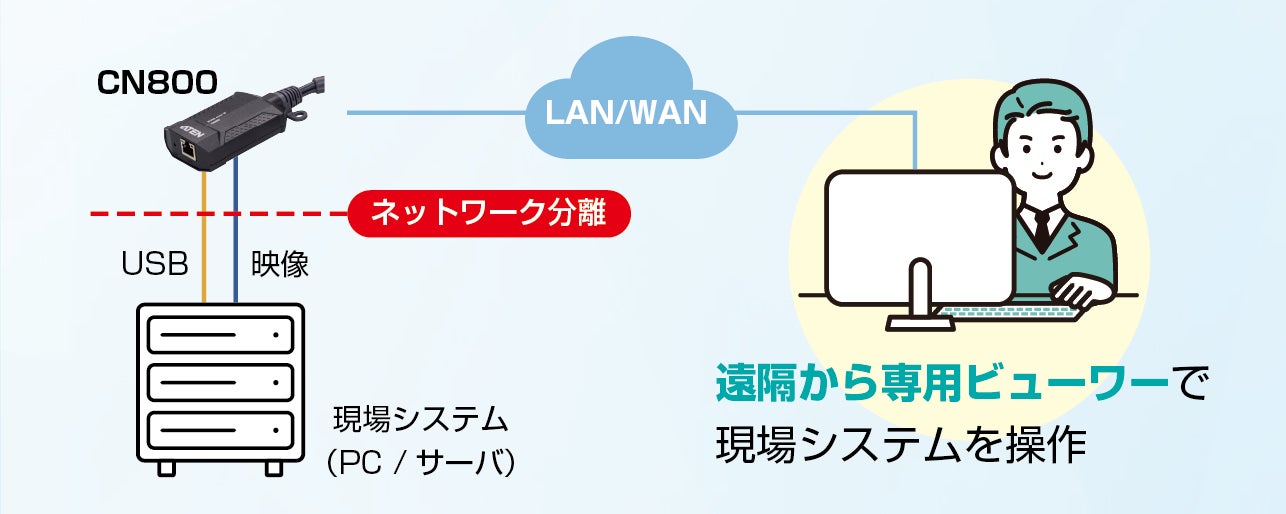 ハンディIP-KVM『CN800』は、リモートアクセスを行いたいPCやサーバーに接続し、専用ビューワーを通じて遠隔からリアルタイムな操作を可能にするKVM over IPユニットです。