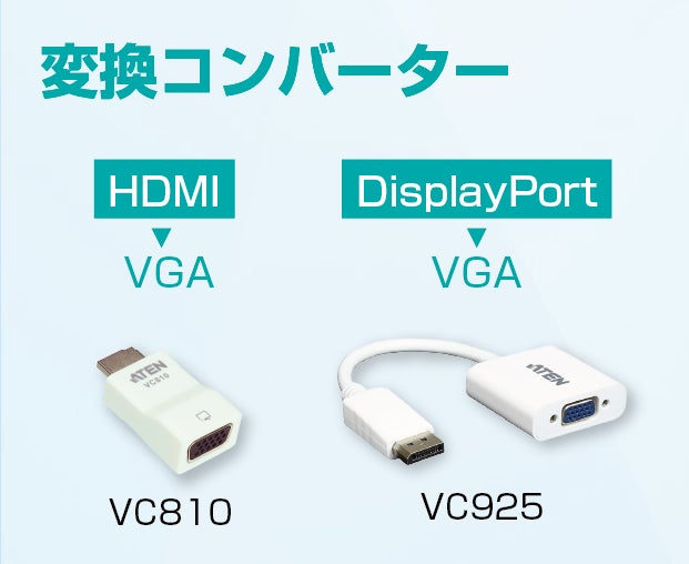 VGA以外のコネクター搭載のデバイスでも、コンバーター(※別売り) を使えば接続可能です。