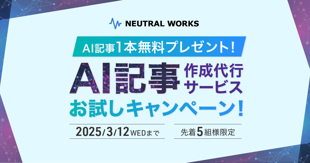 株式会社ニュートラルワークス(本社:神奈川県藤沢市、代表取締役:三木五月、以下「ニュートラルワークス」)は、新サービス「AI記事作成代行サービス」の提供開始を記念し、2025年2月26日より先着5社限定で、AI記事を1本無料で作成するキャンペーンを開始いたします。