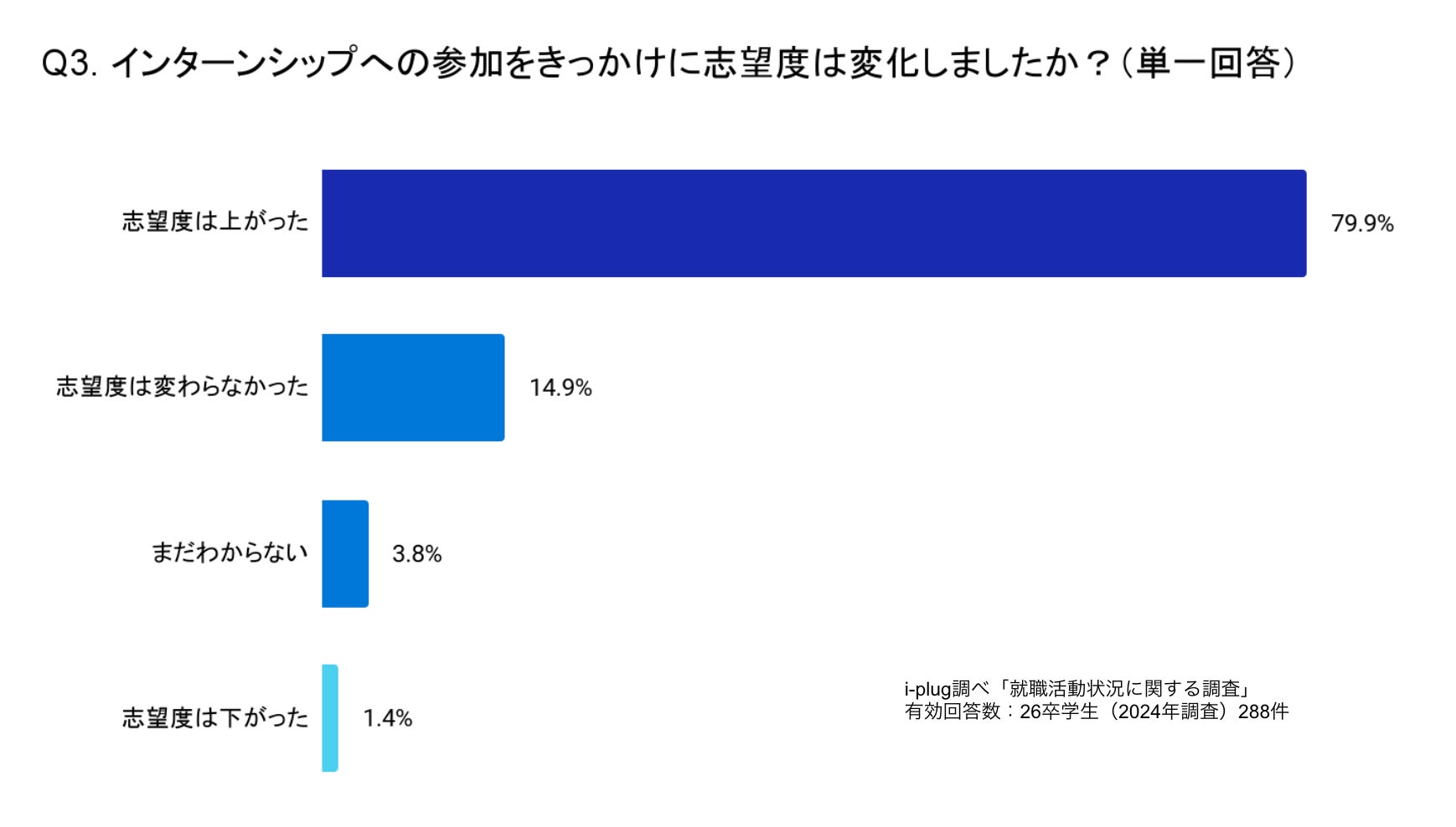 「志望度が上がった」の回答が最多の79.9%でした。インターンシップの参加が志望度に影響があることが推察できます。