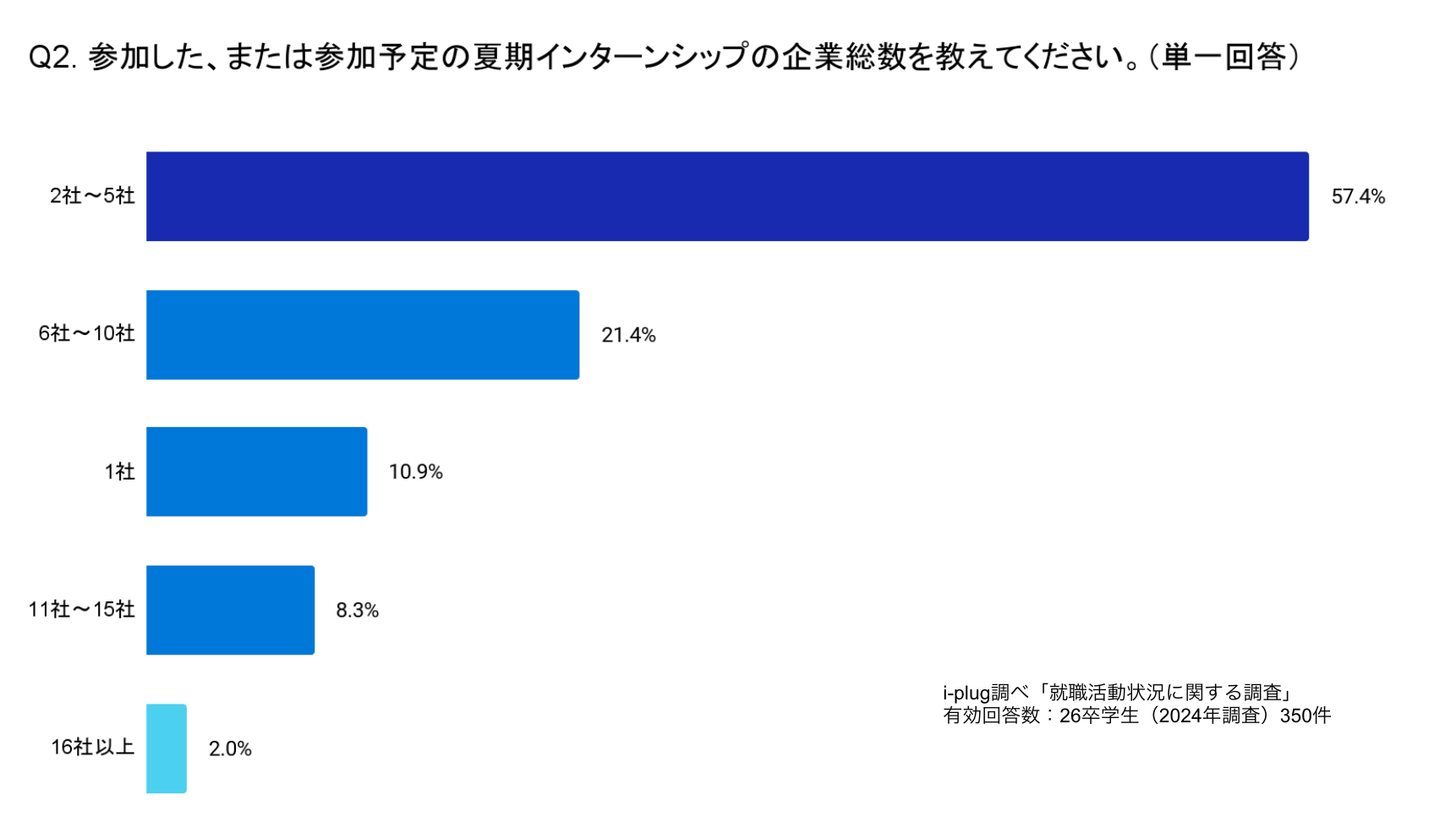 Q2. (Q1にて「参加しない」と回答した方以外に伺います。)参加した、または参加予定の夏期インターンシップの企業総数を教えてください。(学生対象/単一回答)