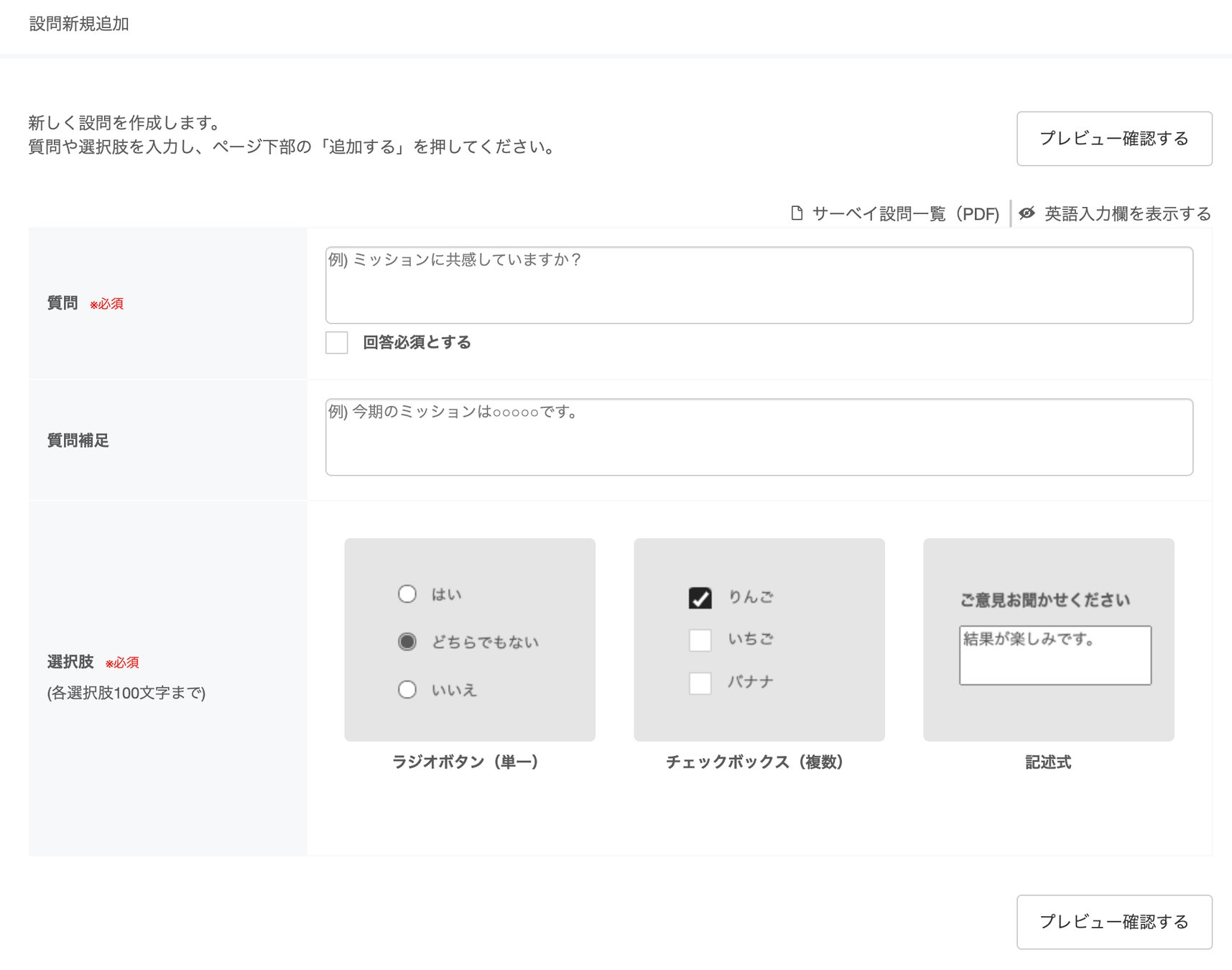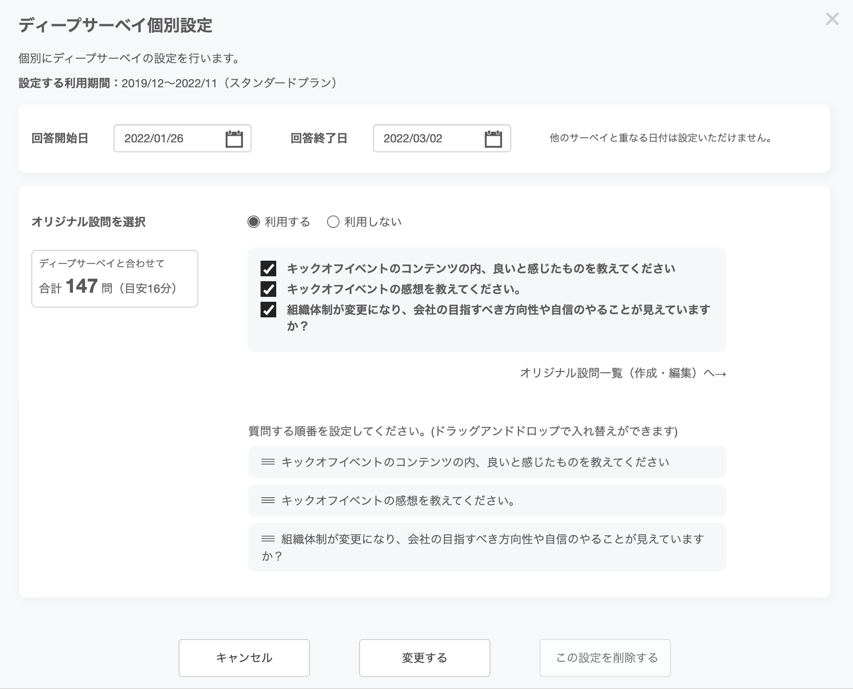 組織の状況に応じて従業員の声を拾い、状態の変化を把握し、反応の見える化、アプローチをしやすくしたいというご要望もふまえ、お客様企業で設定したい設問を、簡単に複数設定できる「オリジナル設問複数設定」機能を実装いたしました。