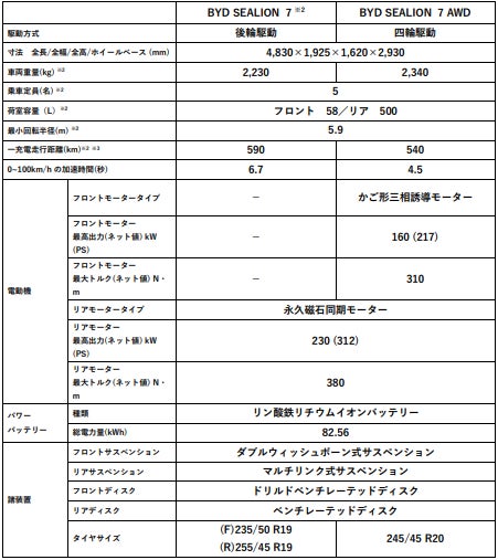 「BYD SEALION 7」は、BYDの日本導入BEVシリーズの第4弾となります。「BYD SEALION 7」は、海洋シリーズの特徴である伸びやかでエレガントなデザインを、力強いSUVのフォルムに落とし込んだクロスオーバーSUVとして登場します。モデルラインアップは、ベースモデルで後輪駆動(RWD)の「BYD SEALION 7」と四輪駆動の「BYD SEALION 7 AWD」の2グレード構成です。四輪駆動モデルは4.5秒で時速100kmに達する優れたパフォーマンスを持ちながら、クラストップレベルの航続距離(540 ㎞/AWD 、参考:590 ㎞/RWD)の双方を両立しています。
