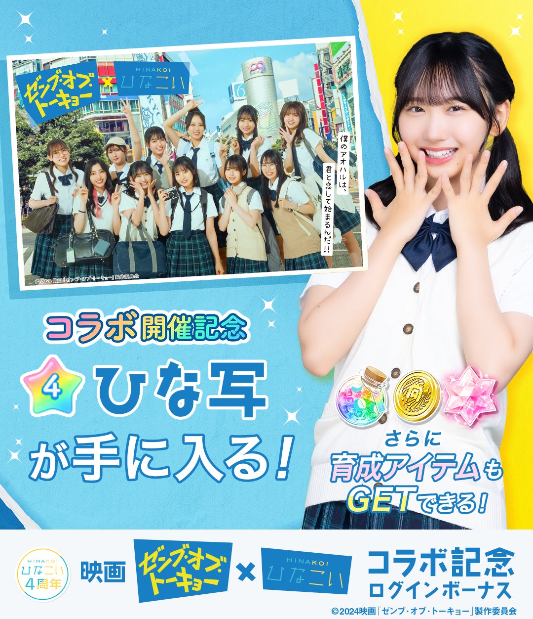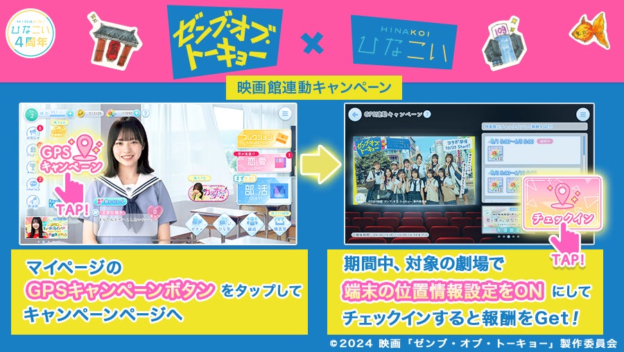 間もなく4周年を迎える本作では、『ゼンブ・オブ・トーキョー』とのコラボレーションイベントを皮切りに日向坂46の様々な衣装での写真や映像コンテンツなどを手に入れることができるコンテンツをご用意しました。「ひなこい」4周年キャンペーン、ぜひ映画『ゼンブ・オブ・トーキョー』と共にお楽しみください。