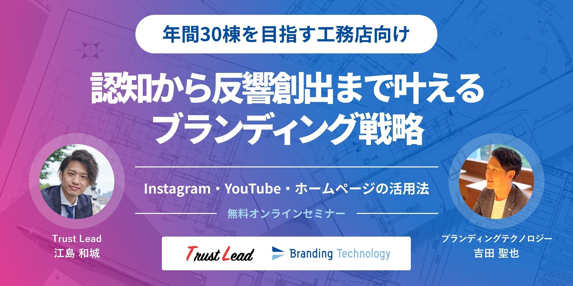 ブランディングテクノロジー株式会社(代表取締役社長:木村裕紀、本社:東京都渋谷区)は、株式会社Trust Lead(代表取締役社長:江島和城、本社:広島県広島市)と共催で、オンラインセミナー「【年間30棟を目指す工務店向け】認知から反響創出まで叶えるブランディング戦略~Instagram・Youtube・ホームページの活用法~」を開催します。