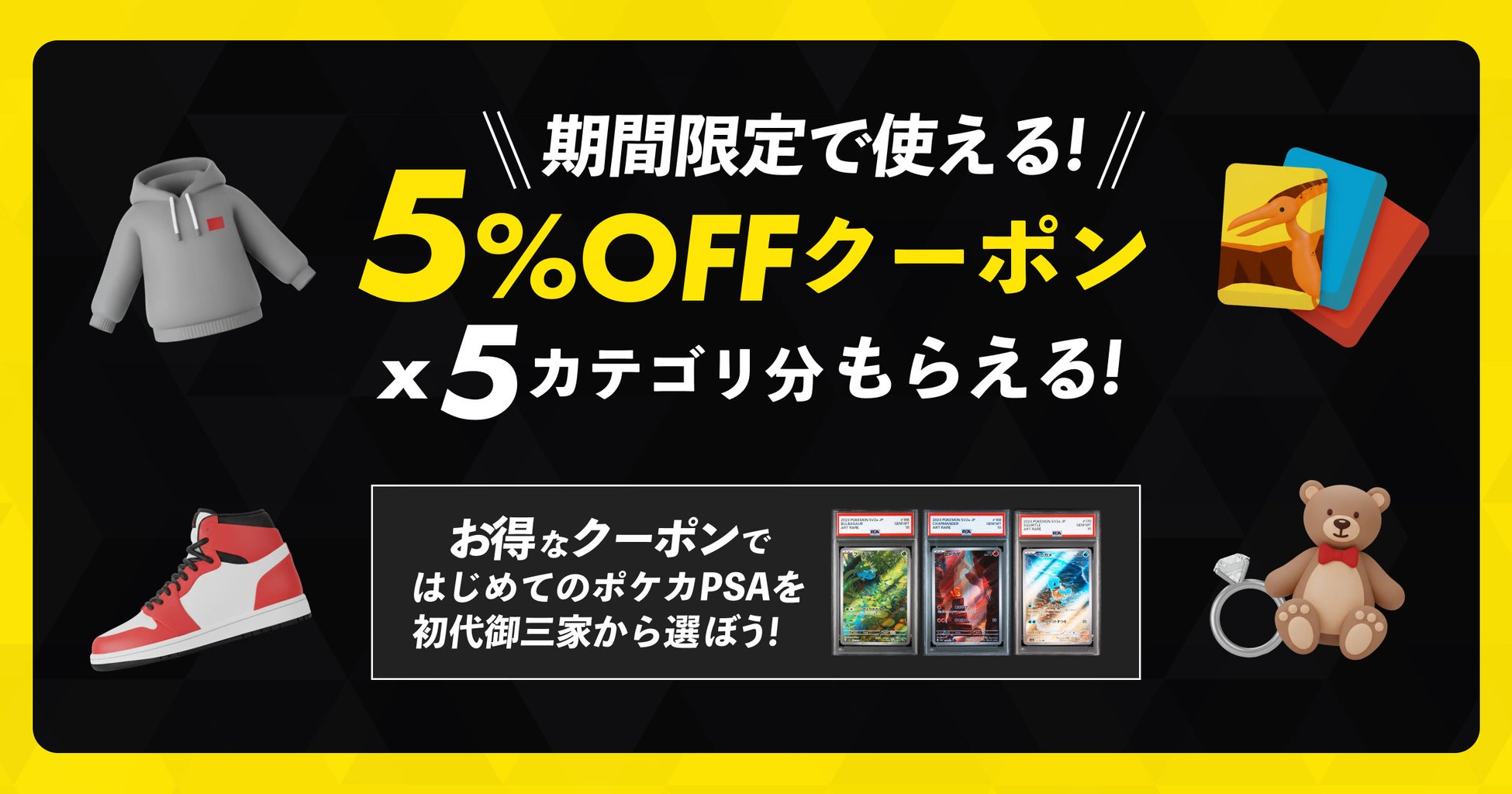 期間中のみ使用できる、「ポケカPSA」「アパレル」「スニーカー」「アクセサリー・バッグ・財布・時計」「フィギュア・ぬいぐるみ」の5カテゴリーを対象とし、お買い物で使えるお得な限定クーポンをプレゼントします。