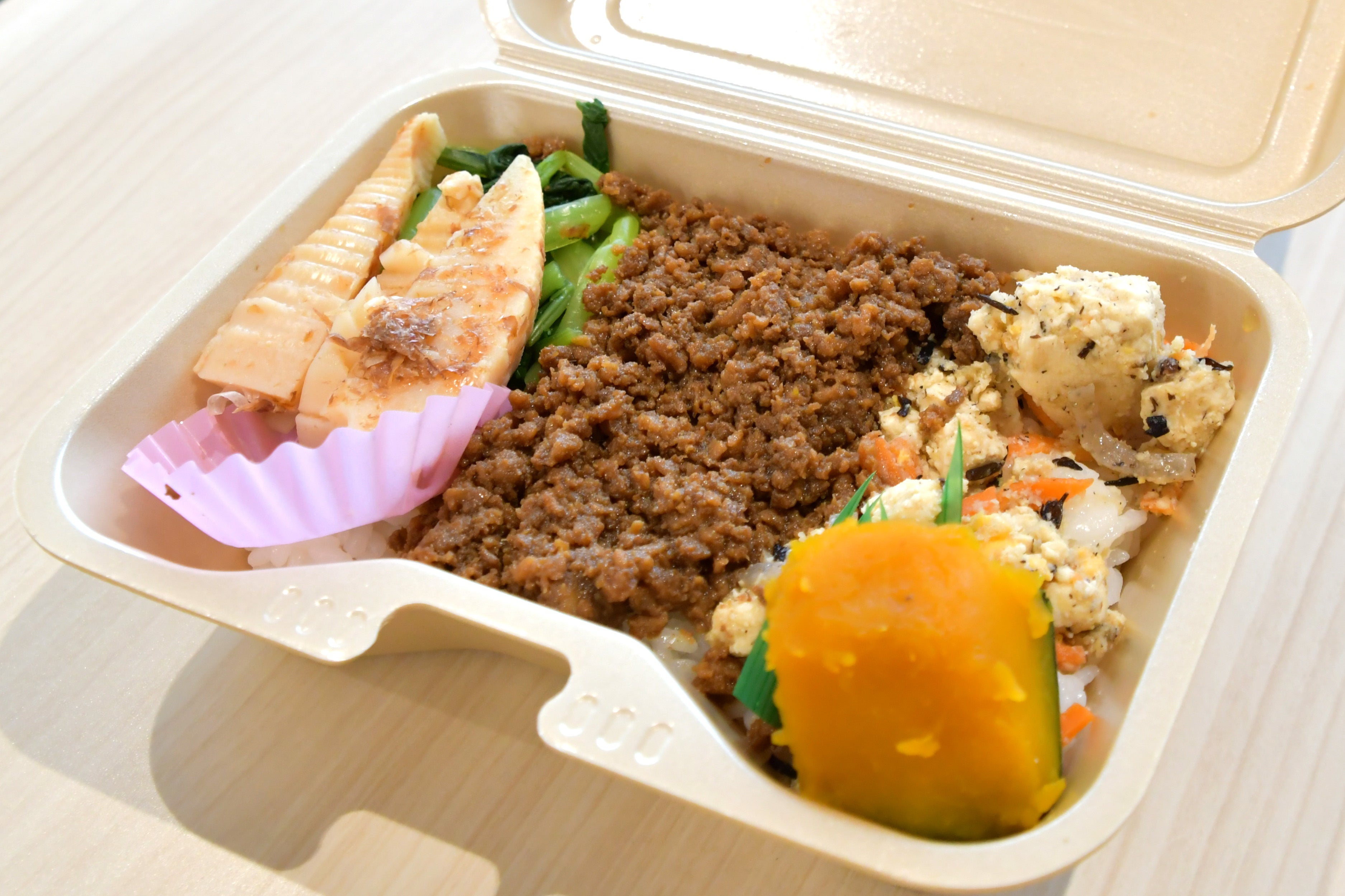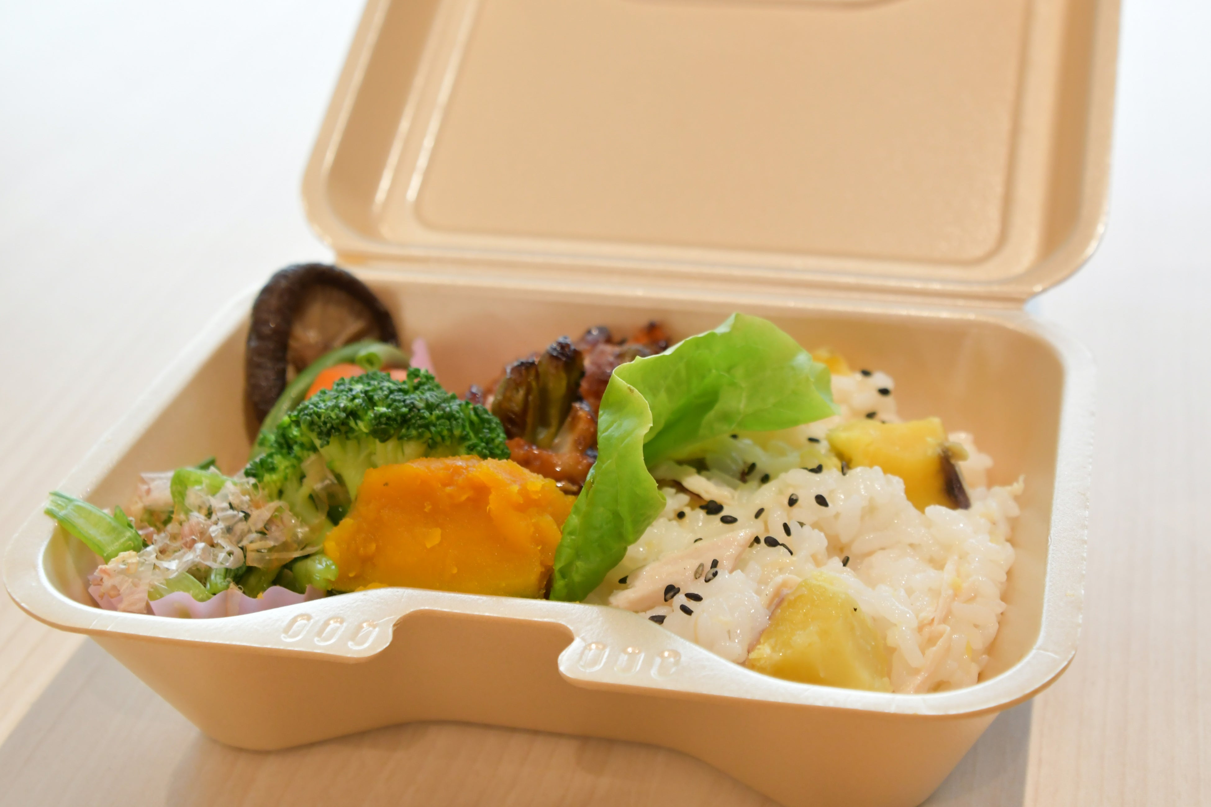 今回のコラボ弁当の開発では、「ぶんこ食堂」の約4年半の活動のなかで提供されたメニューから厳選した「さつまいもとささみのご飯」と「炒り豆腐」の2品を軸としました。