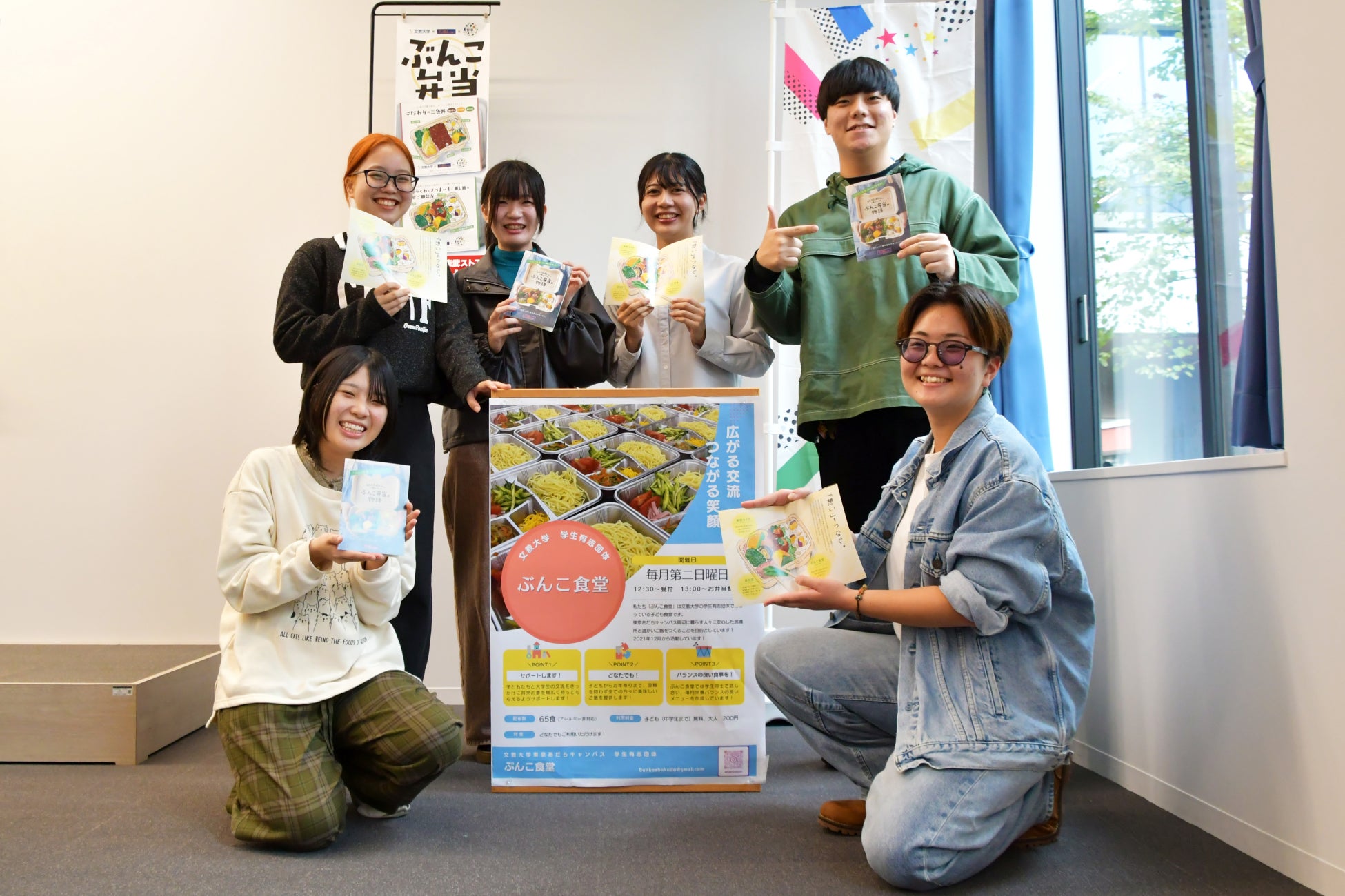 「ぶんこ食堂」は文教大学内の学生有志団体として2021年に活動を開始したこども食堂です。毎月第2日曜日に、文教大学東京あだちキャンパスの学生食堂で、学生が手作りしたお弁当を地域の子どもたちに配布しています。