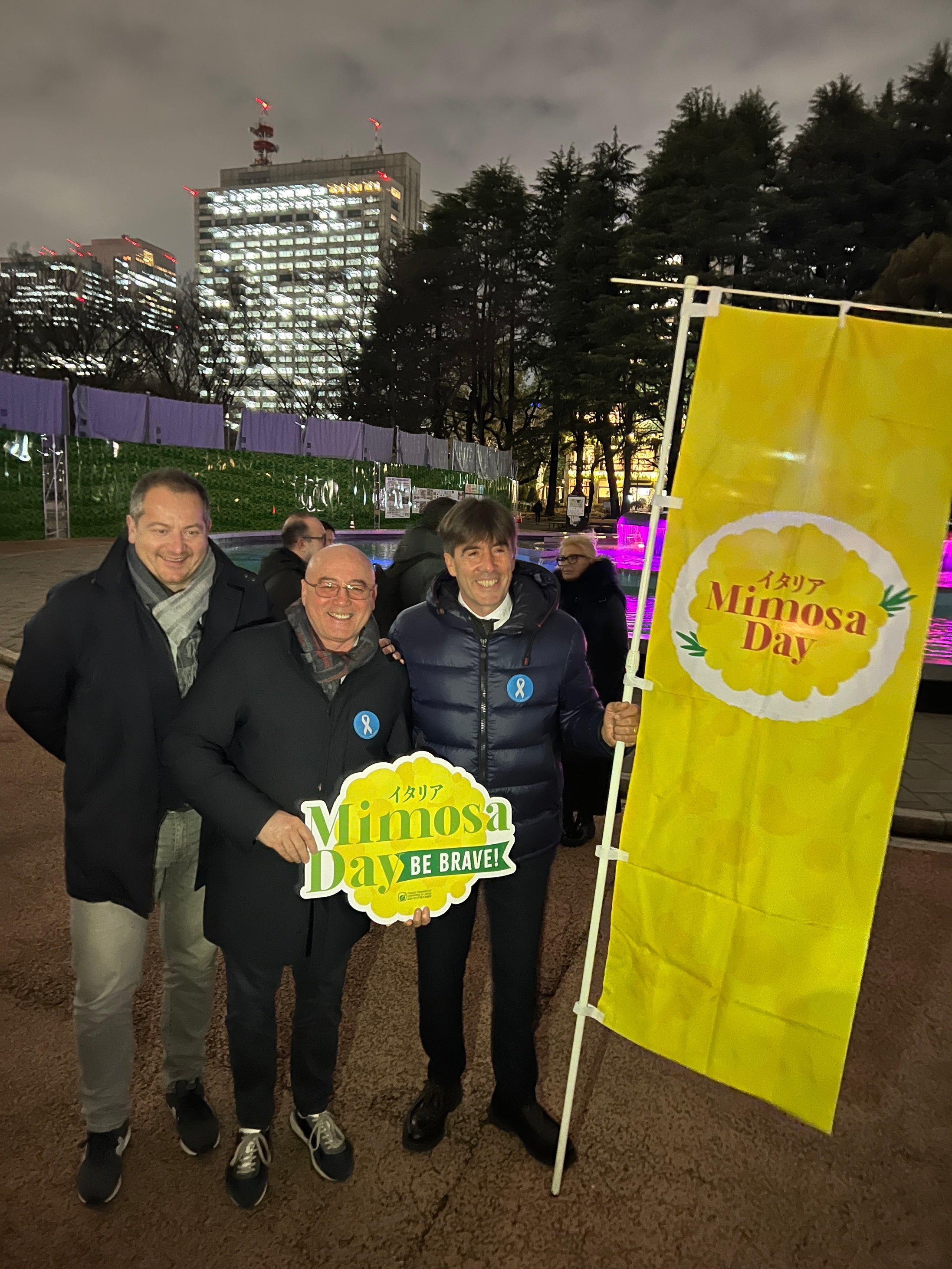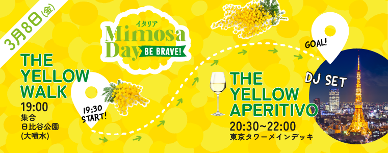 3月8日は、イタリアでは、男性が日々の感謝の意を込めて、女性に美しいミモザの花を贈り、女性の社会での活躍を祝福しています。在日イタリア商工会議所は、女性のエンパワーメントを促進するために、このすてきなイタリアの文化習慣を日本に訴求する活動として、「イタリアMimosa Day(ミモザ デイ)」というイベント事業を推進しています。2021年から始まったこのイベント事業は今年で4年目となり、今年のテーマは「BE BRAVE!勇気」=勇気に満ち溢れて様々なことに挑戦している女性を応援するエールを込めています。その中でも最も重要なイベントコンテンツである「THE YELLOW WALK」がミモザの日3月8日(金)開催されました。早朝には雪の舞う東京でしたが、夕方には雪も止んで、約50名の人々が「THE YELLOW WALK」のスタート地の日比谷公園に集結しました。参加の約90%は女性で、多くの人々は、ミモザカラーの幸せを運ぶ黄色のものを身にまとい、日本のシンボルのひとつである東京タワーを目指しました。毎年楽しみに参加している方も多くいました。まるでミモザの花のように和やかな雰囲気の中、来日中のイタリアの皆様も賛同して、今年のテーマに相応しい「BE BRAVE!勇気」な女性たちによる「THE YELLOW WALK」は盛大に開催されました。