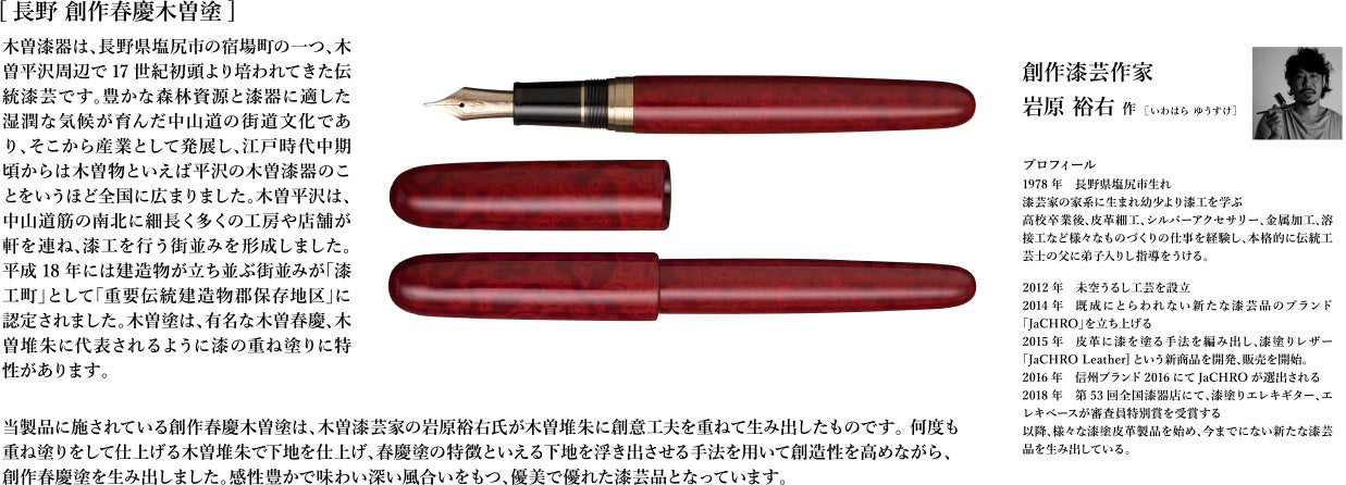 伝統漆芸 麗 は、「漆」を塗り上げ装飾する伝統漆芸を用いた筆記具のシリーズです。2019年6月、シリーズの第一弾として、「輪島 曙塗」、「輪島 溜塗」、「津軽 錆塗」を発売しました。その後第二弾は2021年10月、「岩手 樹水塗」、「青森 流紋塗」、「石川 創作加賀塗」の3種を発売。第三弾は2022年12月、「福井 創作若狭塗」、「青森 八戸塗」の2種を、第四弾では「青森 風雅文塗」の発売と続き、第五弾となる今回は「石川 創作春慶加賀塗」、「長野 創作春慶木曽塗」の2種を追加いたします。