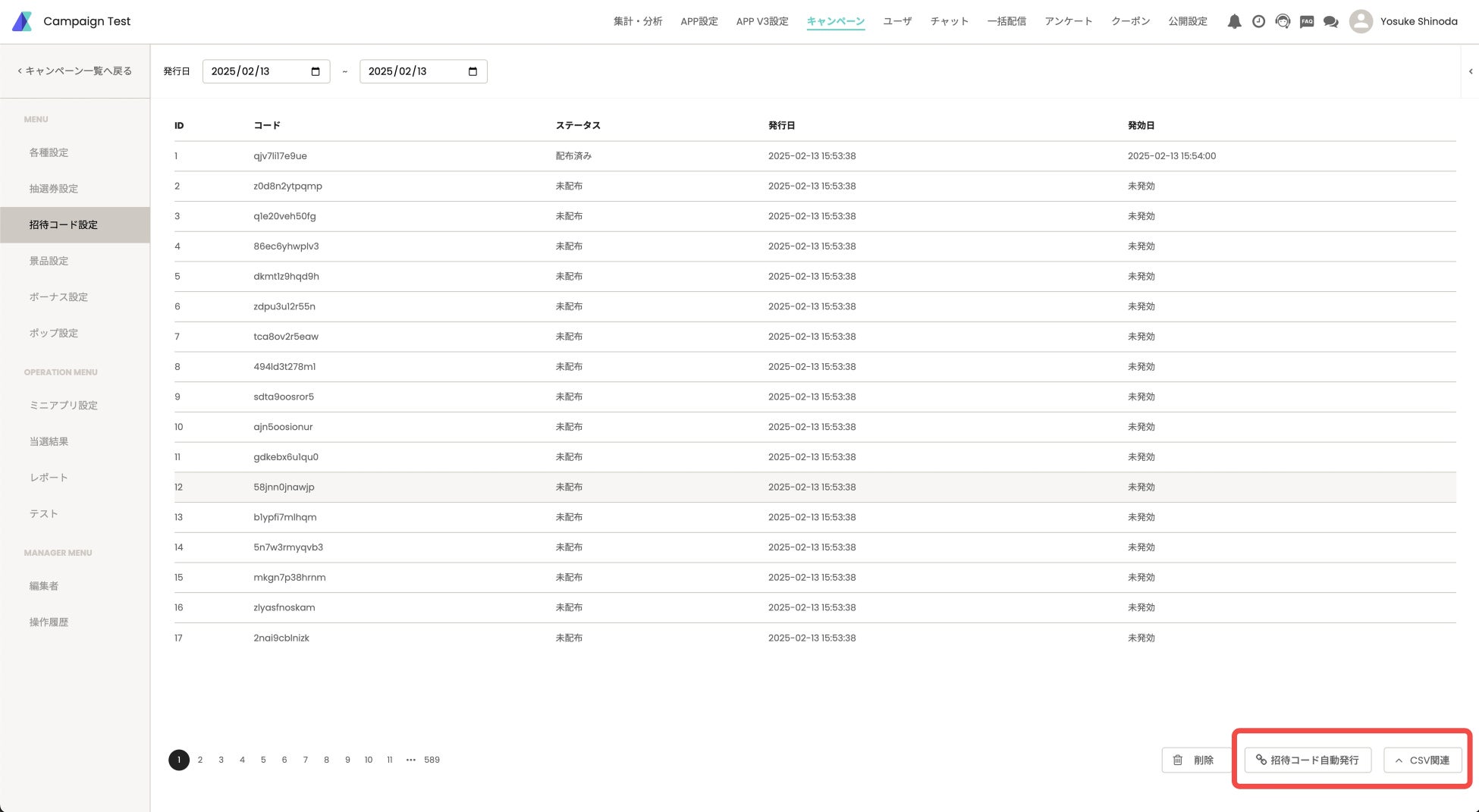 1.キャンペーン>各種設定>参加当選設定>「招待コード」をチェックします。