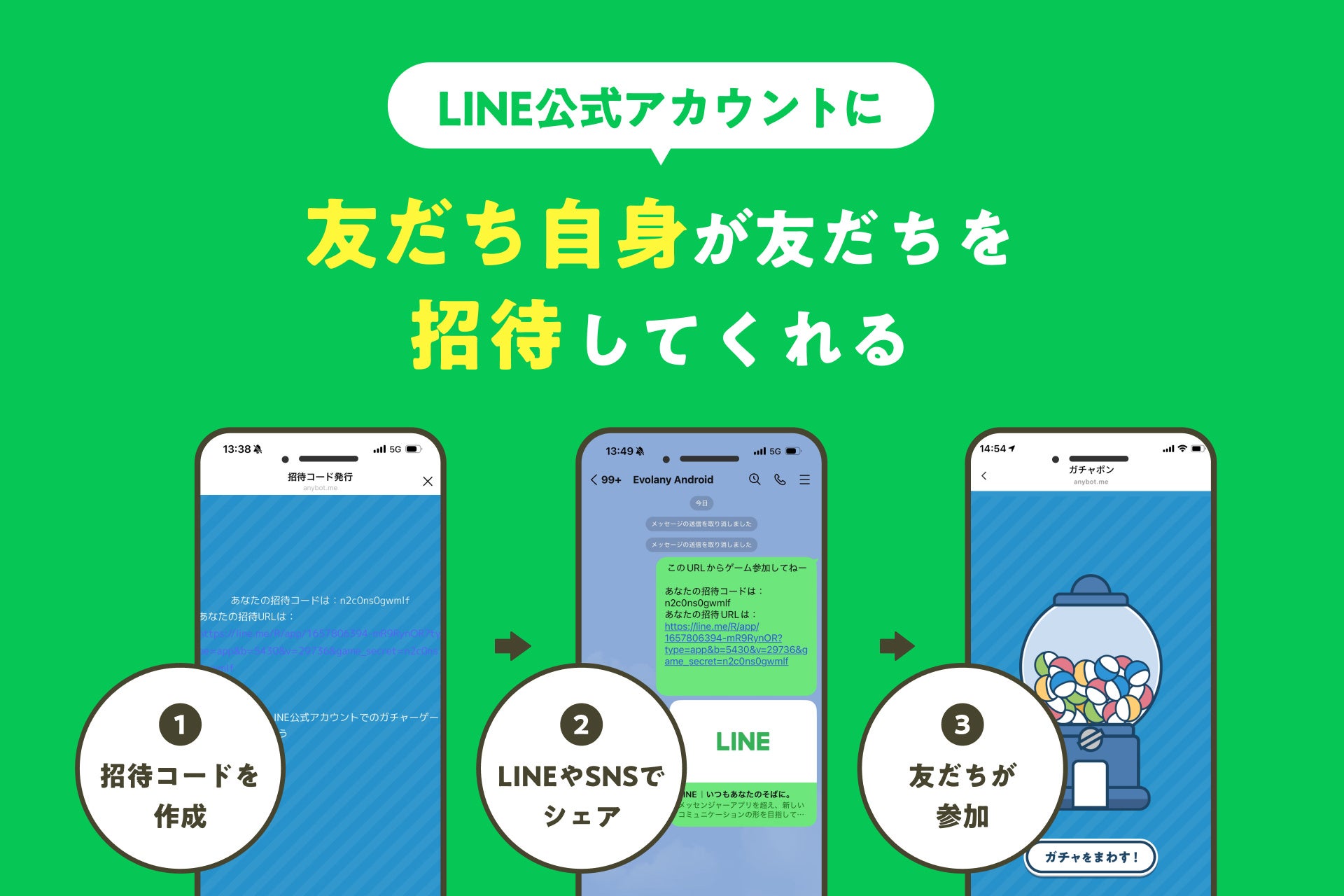 エボラニ株式会社が提供するLINE向けマーケティングツール「anybot」には、ガチャポンゲームをデジタルで楽しめる機能があります。これまでゲームに参加できるユーザー(LINEの「友だち」)を決めるのは管理者のみでしたが、今回の機能拡充でユーザー自身が別のユーザーを招待できるようになりました。より多くの人にLINE公式アカウントでのガチャを楽しんでもらい、お店やブランドをもっと好きになってもらいましょう。