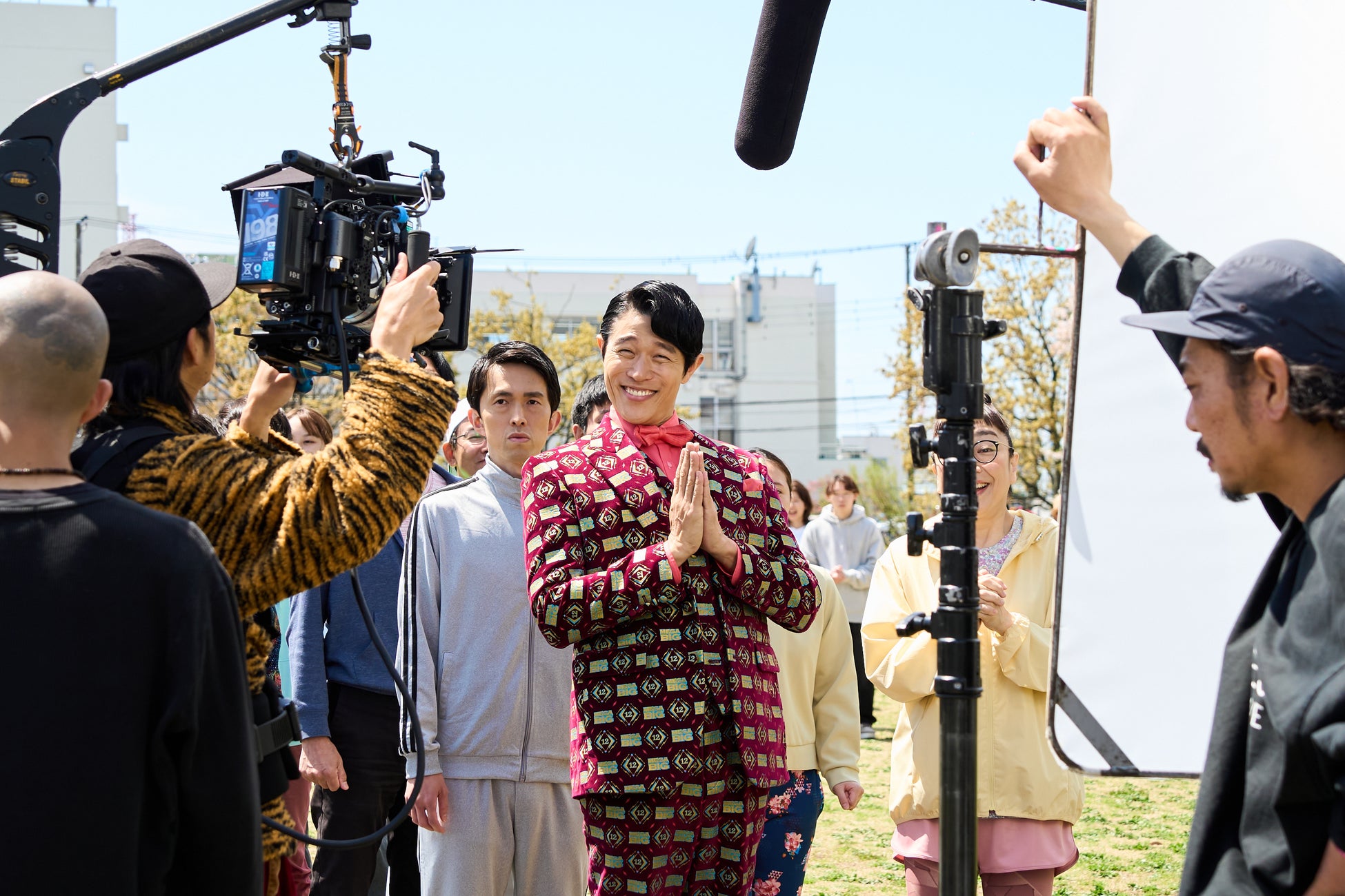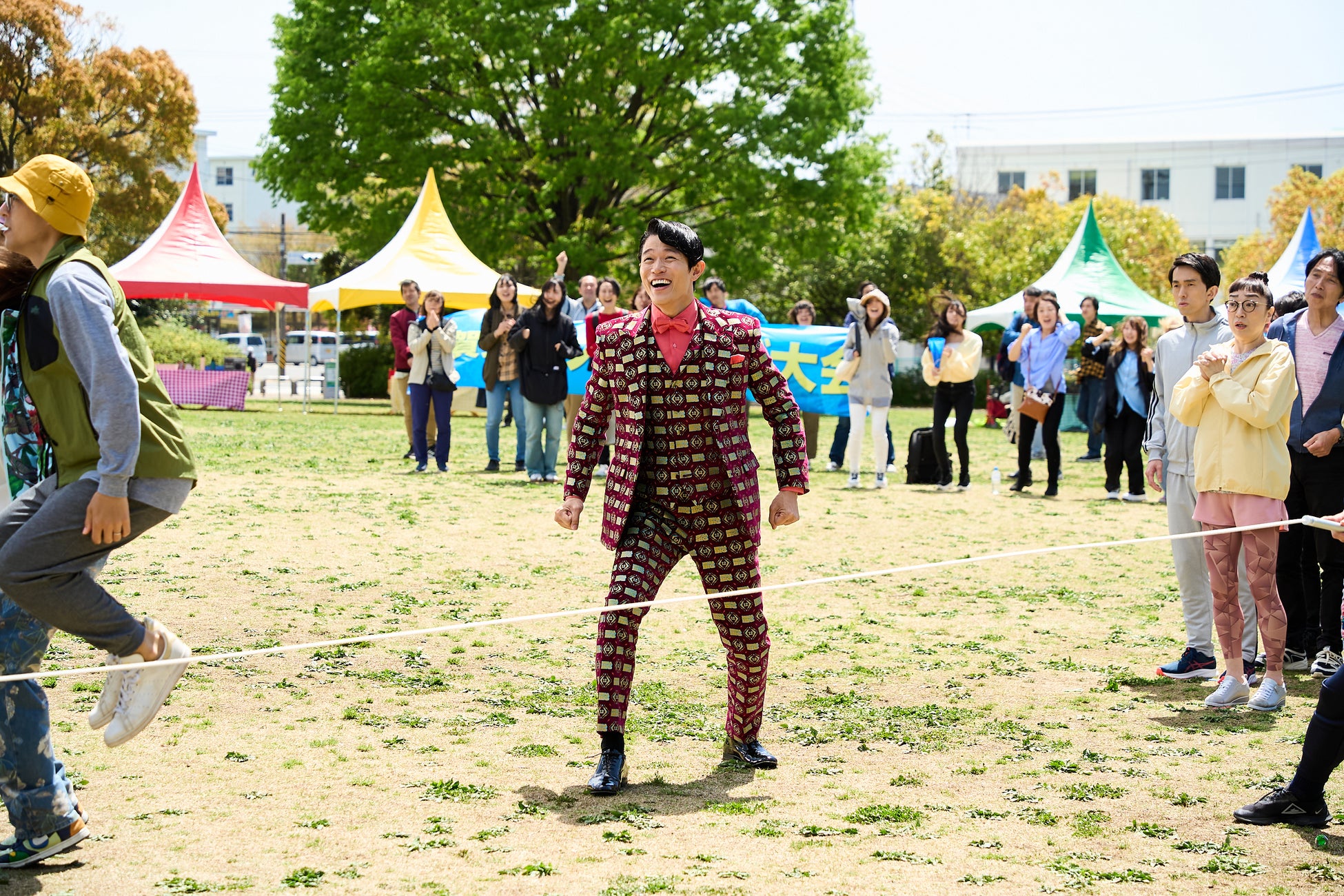 快晴の空の下、馴染みのある華やかな衣装で撮影入りした鈴木亮平さん。カメラに手を振り、明るい表情で「よろしくお願いします」とスタッフに挨拶。撮影監督との打ち合わせではさっそく億山を演じて見せる場面がありました。今回は大勢のエキストラが参加している中で撮影がスタート。億山独特のリズミカルなセリフと大縄跳びに挑戦しようとタイミングを計るも入れないコミカルな動きに挑む鈴木亮平さん。カットの声がかかると、億山の姿に共演者・スタッフが思わず笑ってしまうシーンも。一方で、自分の演技を真剣に確認する場面や監督と細かい動きを確認する姿も垣間見え、良い緊張感がありながらも和やかな雰囲気の撮影現場となりました。地域の大縄大会で次の12億当せん者は自分かもしれないというワクワクを楽しそうに表現する億山に注目です。