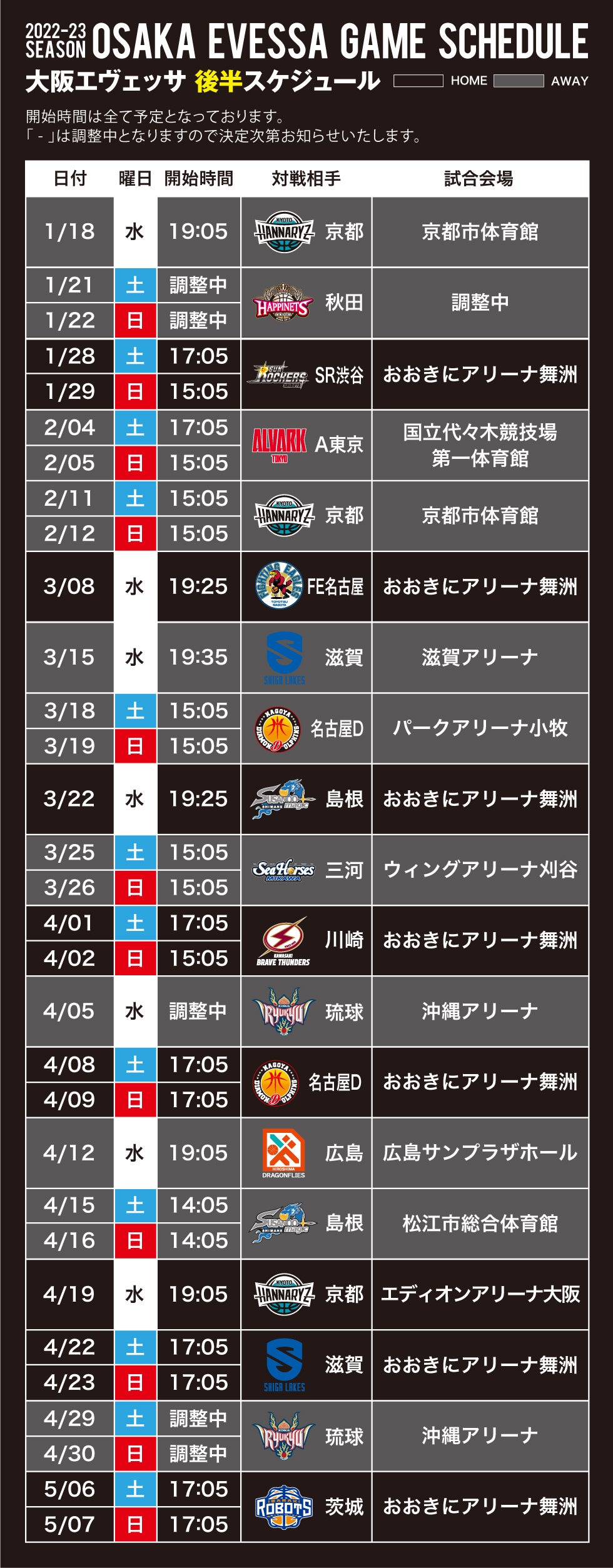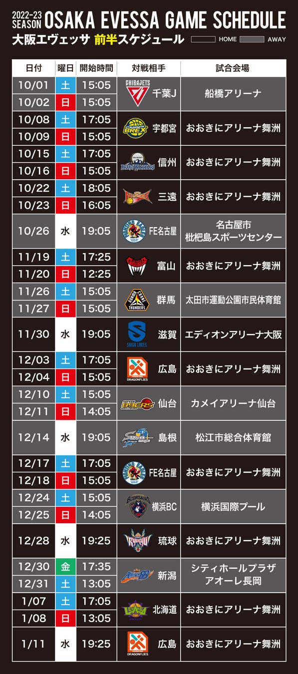 大阪エヴェッサ 2022-23シーズン 全試合日程決定のお知らせ