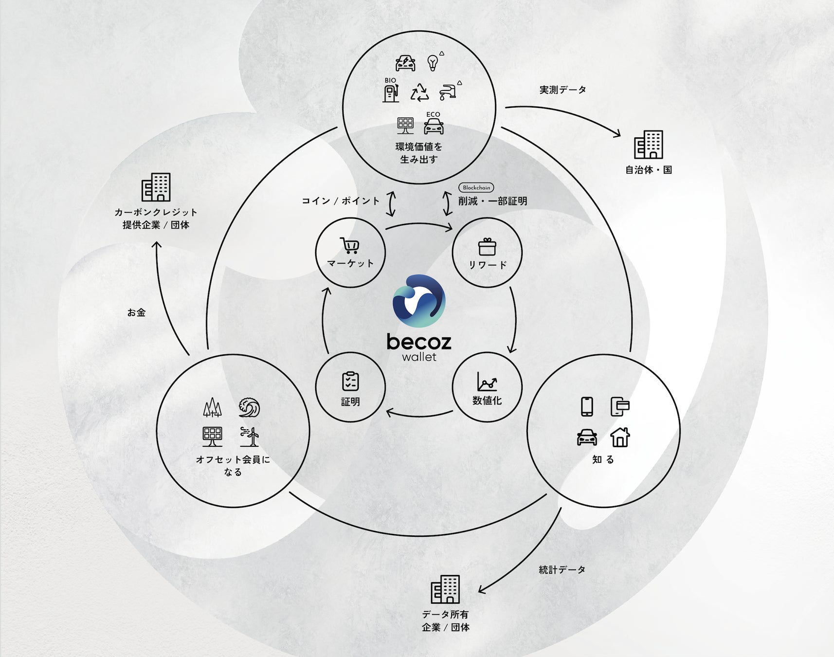 環境配慮の行動や消費によって得られる価値を、becoz coin(地域通貨)やbecoz point(環境版企業ポイント)として可視化・流通することで、コミュニティの環境価値を増幅させます。