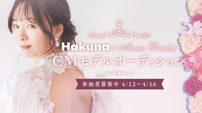 株式会社MOVEFAST Company (東京都港区三田、代表取締役社長:Linda Su Ah Kim)は、ライブ配信アプリ「Hakuna」において、4月12日(金)からAnnie BridalのCMモデル掲載権やウェディングフォト撮影権をかけたイベントの募集が開始することをお知らせします。