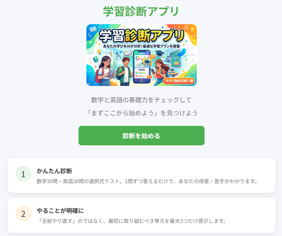 ・アイディア高等学院アプリ:小中学校の苦手部分を診断することで、必要な部分のみを効率よく学びなおすことができます。