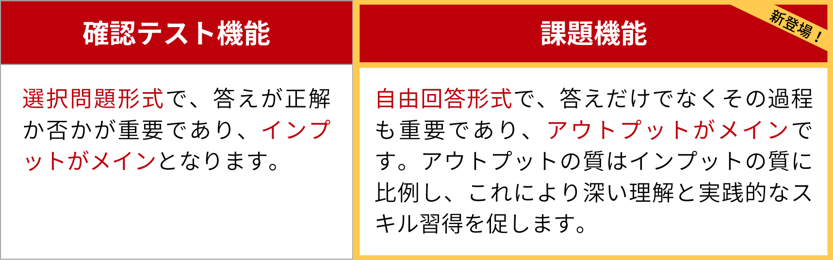 課題機能は、侍テラコヤのオリジナル教材に紐付く「課題」を提供するコンテンツです。インプットを目的とした選択問題形式の「確認テスト機能」とは異なり、自由回答形式の「課題機能」では答えを導き出す過程の思考力も求められるため、より質の高いアウトプット力を身につけることができます。