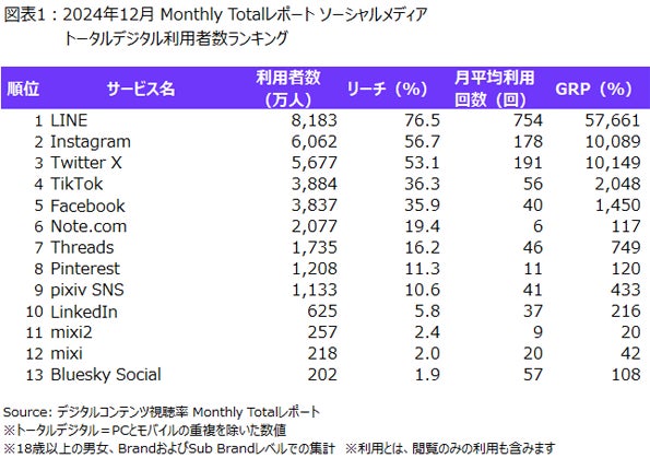 2024年12月のMonthly Totalレポートによると、ソーシャルメディアにおいて、利用者数が最も多かったのは「LINE」で8,183万人、「Instagram」が6,062万人、「Twitter X」が5,677万人で続いていました。また、月平均利用回数は「LINE」が月754回で最も多く、「Twitter X」が月191回、「Instagram」が月178回で続いていました(図表1)。