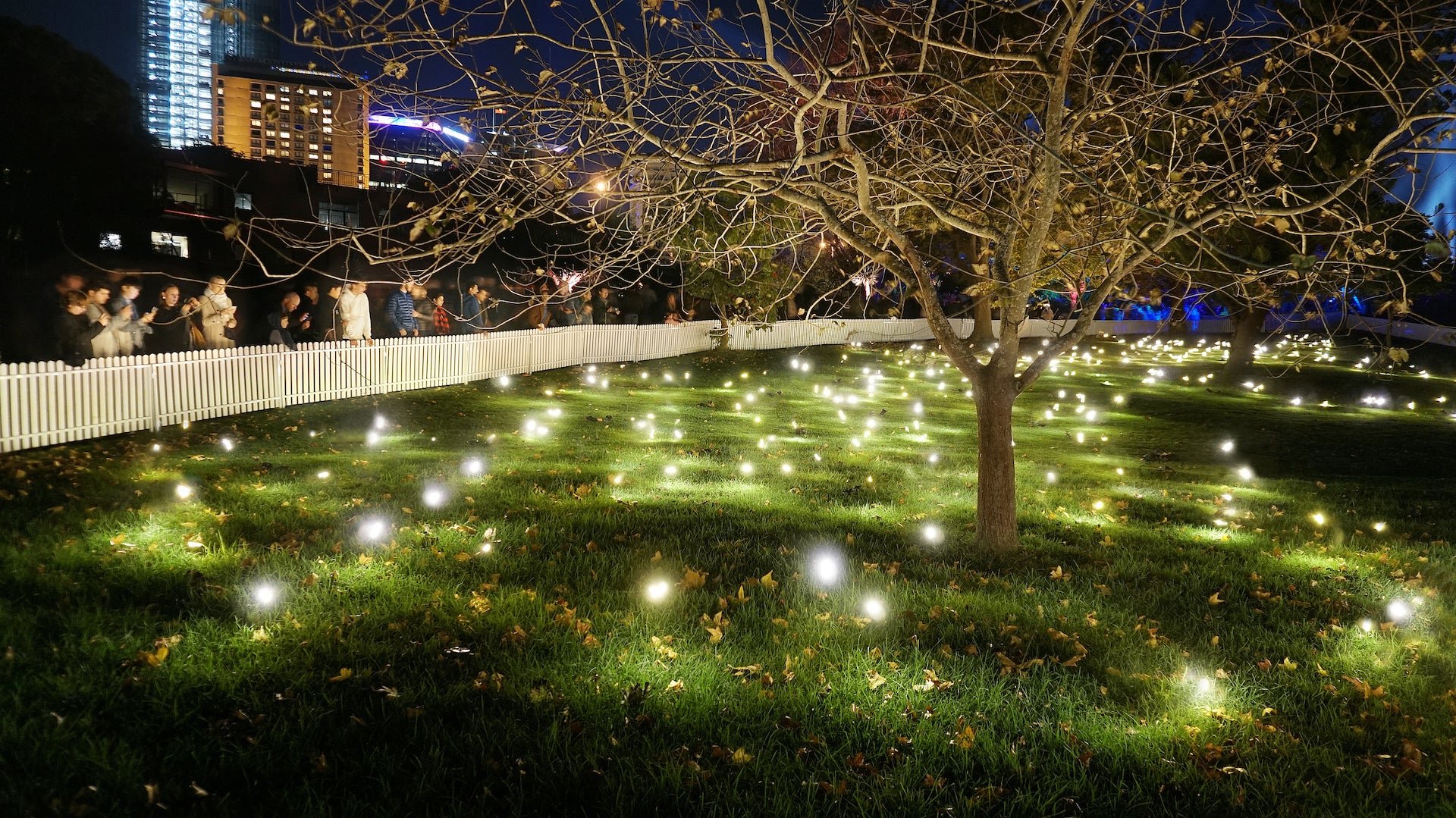 芝生の広場に、無数の光が宵闇を飛び交うインスタレーション。生物発光(bioluminescence)によって闇に輝くホタルにインスピレーションを受けた作品で、透明なカプセルに収めた LED の光がシンプルな動力で予測不能に動きまわる。