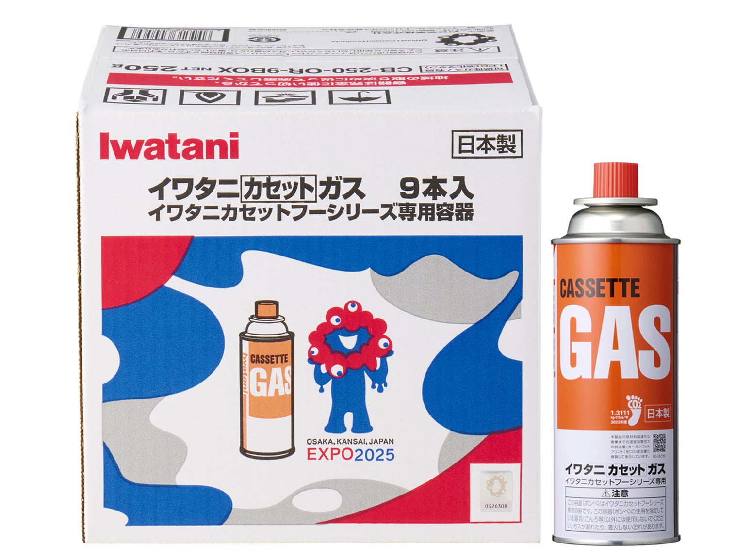 本商品は、アウトドアや防災シーンで活躍する「イワタニ カセットガス9本ボックス」のパッケージに「ミャクミャク」のデザインを施した、大阪・関西万博を記念する特別仕様の商品です。なお、デザインが変更されるのは化粧箱のみで、カセットガス自体のデザインに変更はございません。
