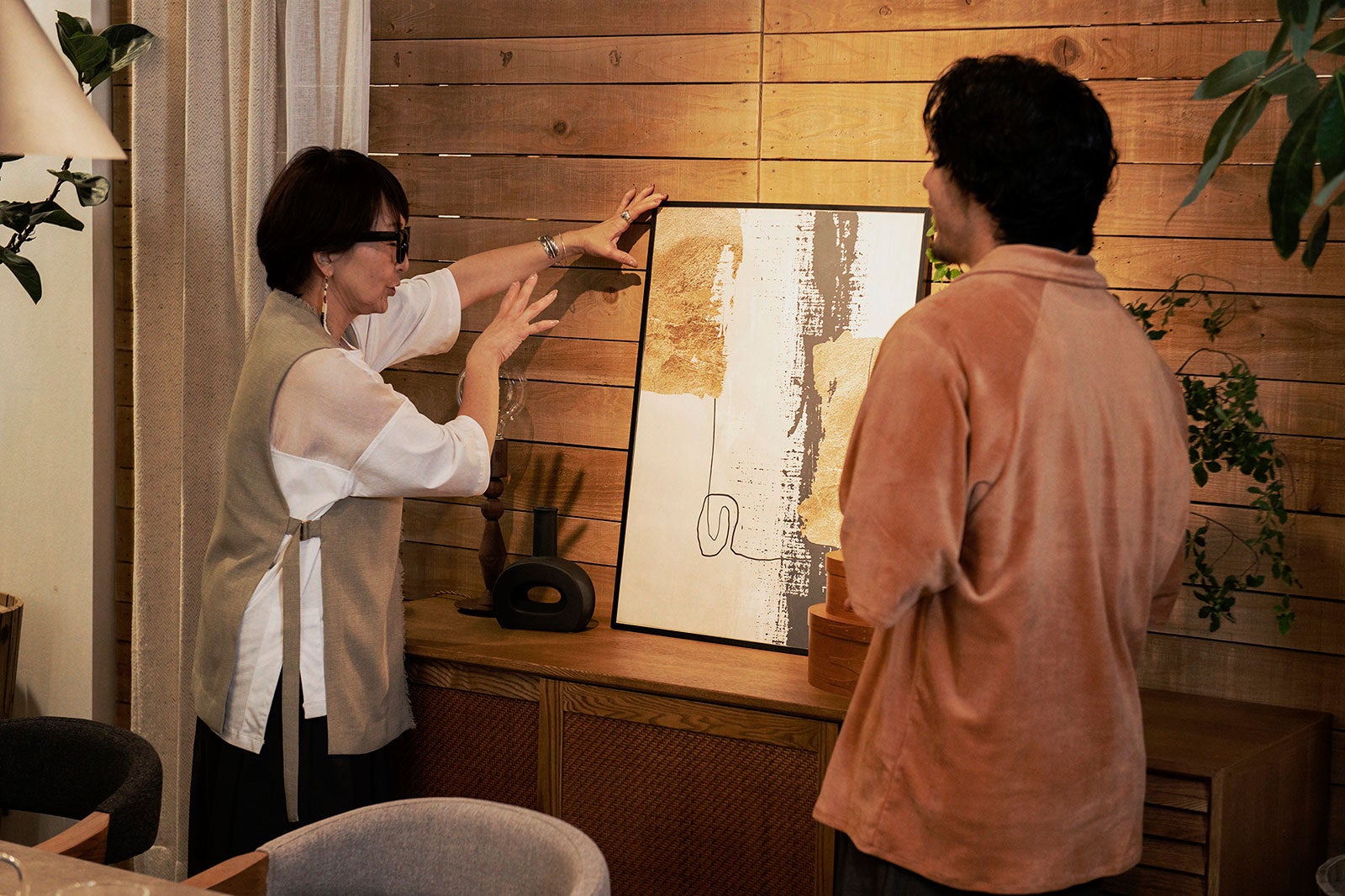 スタイリッシュかつモダンなスタイルにコーディネート。ブラックのソファやセラミック天板のテーブルに、サイドボードやチェア、食器棚には木の温もりが感じられる家具を組み合わせることで、無機質になりすぎないようにしています。壁面や空いた空間には、アートやグリーンを飾って空間を和らげ優しさも感じられるように。