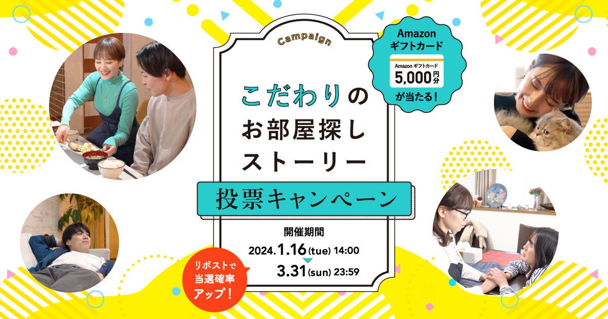 あわせて、X(旧Twitter)で気に入ったショート動画をポストすることで参加できる「こだわりのお部屋探しストーリー投票キャンペーン」を開催します。抽選で毎月20名様にAmazonギフトカード5,000円分が当たるキャンペーンです。