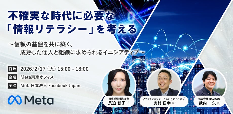 SNS戦略設計を軸に企業様や地方自治体様のコミュニケーション支援サービスを提供する株式会社NAVICUS(本社:東京都千代田区、代表取締役:武内 一矢、以下:NAVICUS)は、2026年2月17日(火)にMeta日本法人 Facebook Japanが主催するシンポジウム「不確実な時代に必要な『情報リテラシー』を考える 〜信頼の基盤を共に築く、成熟した個人と組織に求められるイニシアティブ〜」に、代表取締役の武内一矢が登壇することをお知らせします。