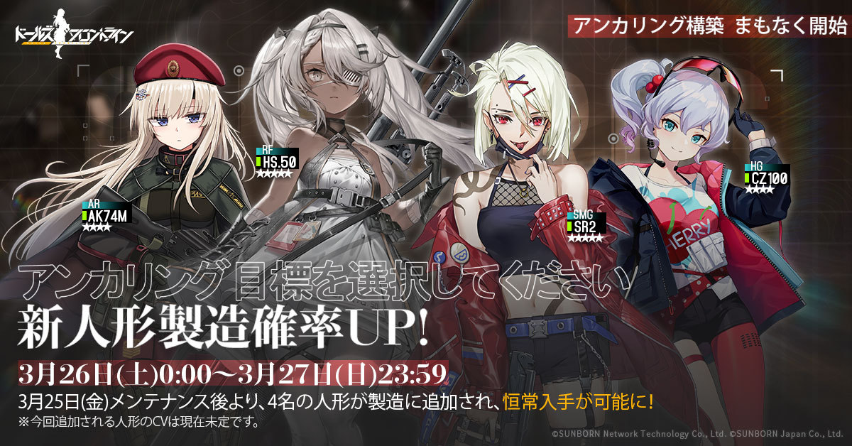 株式会社サンボーンジャパンは、スマホ向け戦略型シミュレーションゲーム『ドールズフロントライン(以下、「ドルフロ」)』において、3月25日(金)より新たな人形4名の追加と、それに伴う確率UPイベントの開催についてお知らせいたします。