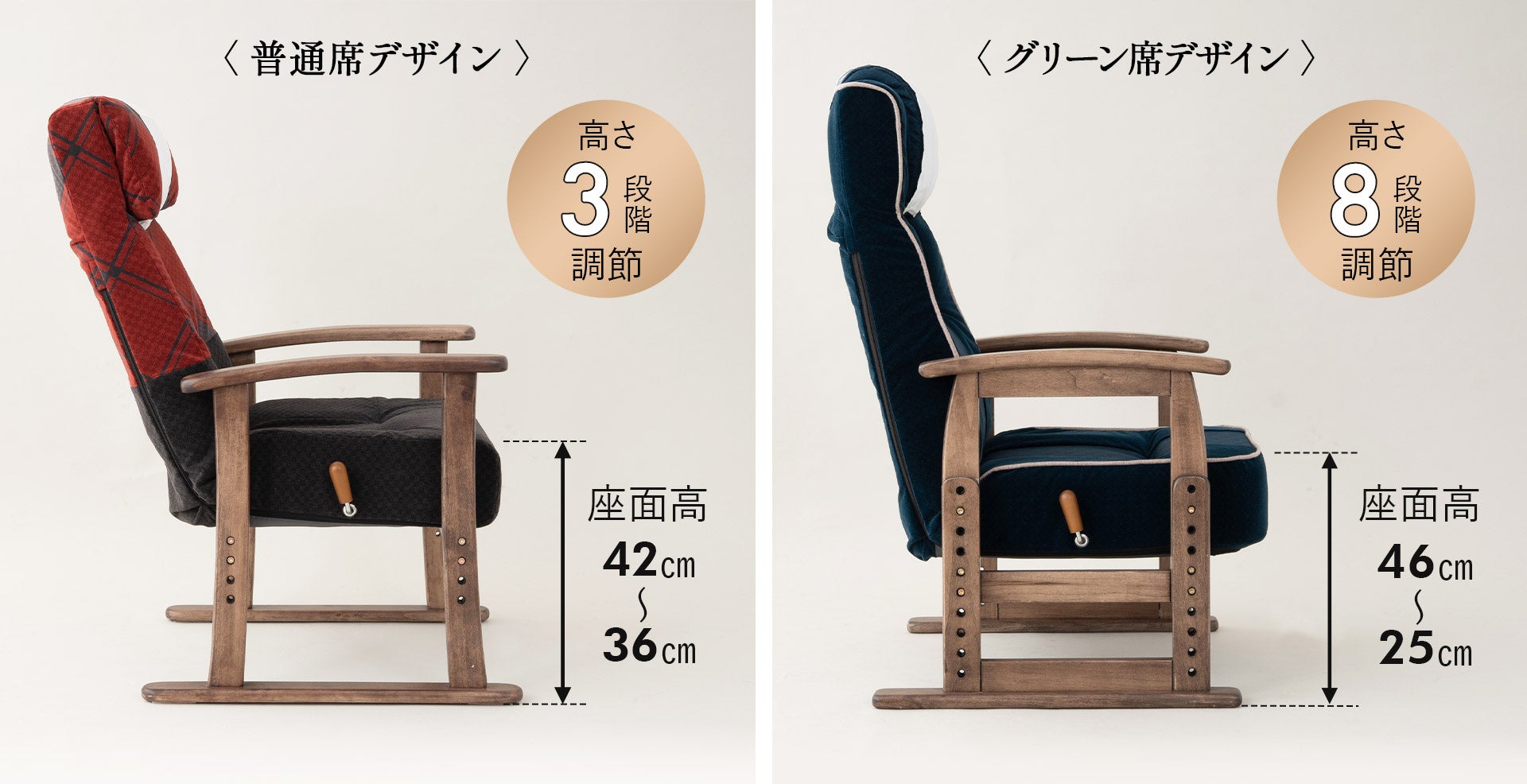 さらに、グリーン席デザインは、脚と肘掛が別パーツなので、座面高を変えても肘掛の高さを一定に保つことができます。座面の高さは付属の六角レンチで簡単に高さ調節ができます。