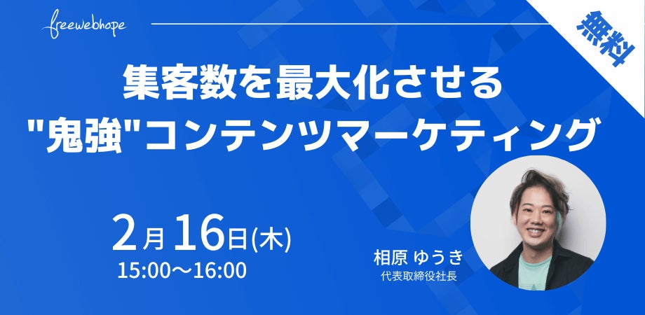 株式会社free web hope(本社:東京都中央区、代表取締役:相原ゆうき)は、無料のオンラインセミナー「集客数を最大化させる"鬼強"コンテンツマーケティング」を2月16日(木)に開催いたします。(お申込みフォーム:https://share.hsforms.com/13TyRY2h-ThOZdhc-0YyaYg5fwo5)