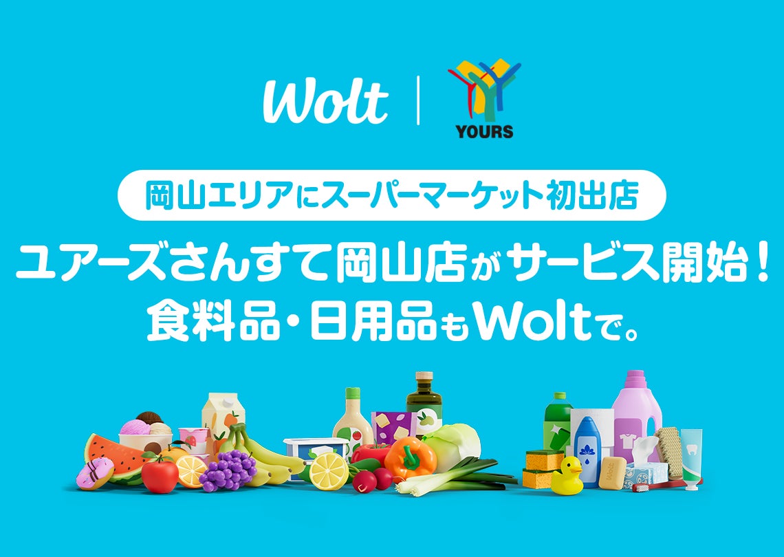 デリバリーサービス「Wolt(ウォルト)」を展開するWolt Japan株式会社(本社:東京都渋谷区、代表:野地春菜、以下 Wolt)と、岡山県と広島県で生活提案型スーパーマーケットを運営する株式会社ユアーズ(本社:広島県広島市、代表取締役会長:根石 紀雄、以下ユアーズ)は、2023年10月25日より、「ユアーズさんすて岡山店」(岡山県岡山市)からのデリバリーサービスを開始いたします。今回のサービス開始は、Woltにおいて岡山県で初めてのスーパーマーケットの出店となります。