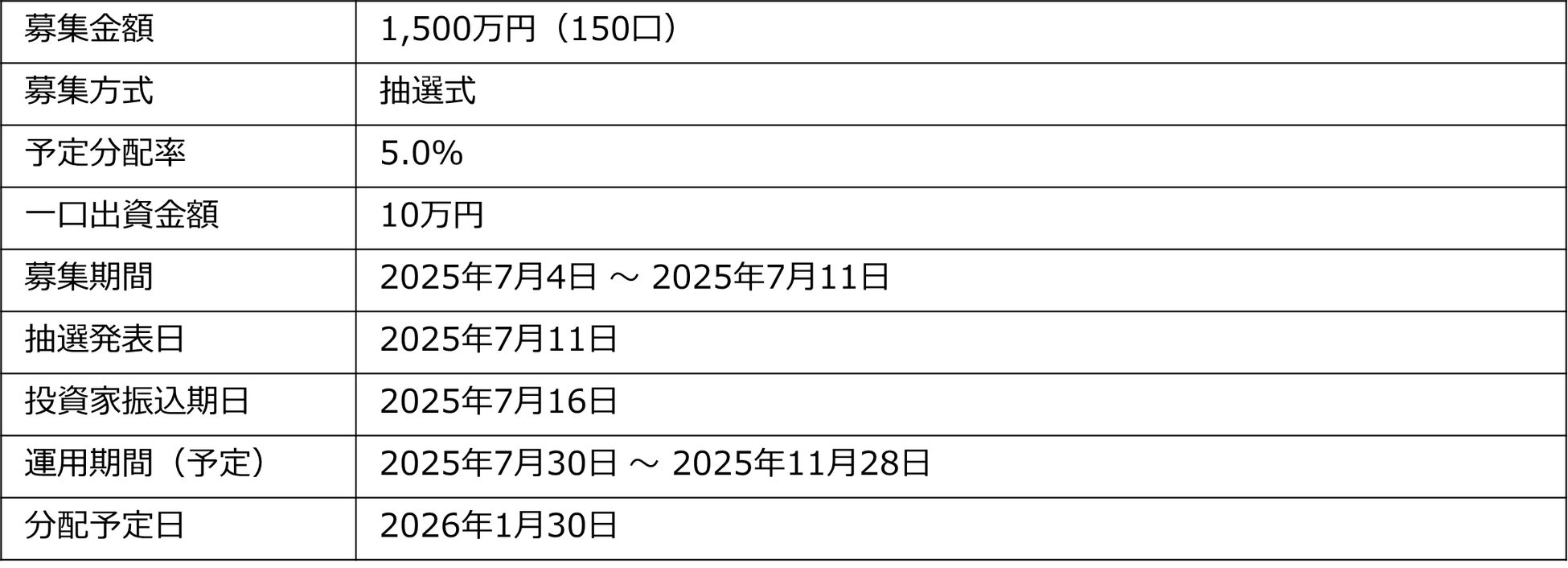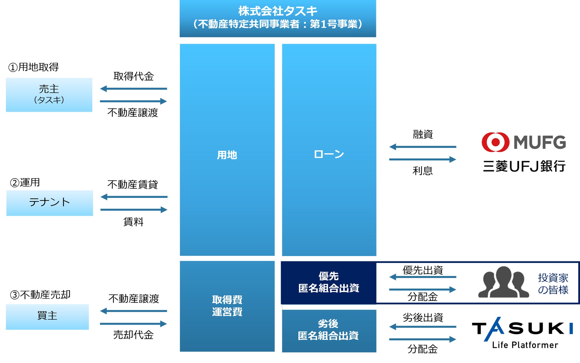 本ファンドは優先劣後方式により、投資家の皆様へは優先出資分として150口を募集します。一方、タスキは30口を劣後出資いたします。万一、損失が発生した場合、タスキが先に損失部分を負担しますので、投資家の皆様は、タスキより優先して出資金の返還を受けることができます。
