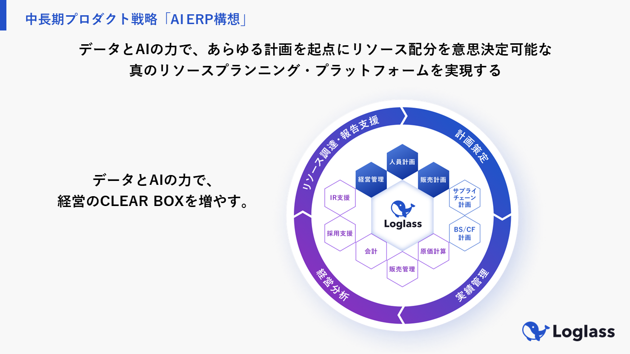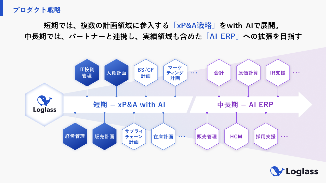 こうした課題の解決に向け、短期的には経営管理領域を起点に、複数の計画領域に参入する「xP&A戦略」をwith AIで展開します。2027年4月までに、提供プロダクト/サービス数を20以上に拡大し、複数のカテゴリでシェアNo.1の確立を目指します。さらに中長期では、パートナーと連携し、実績管理の領域も含めた「AI ERP構想」の実現を目指してまいります。