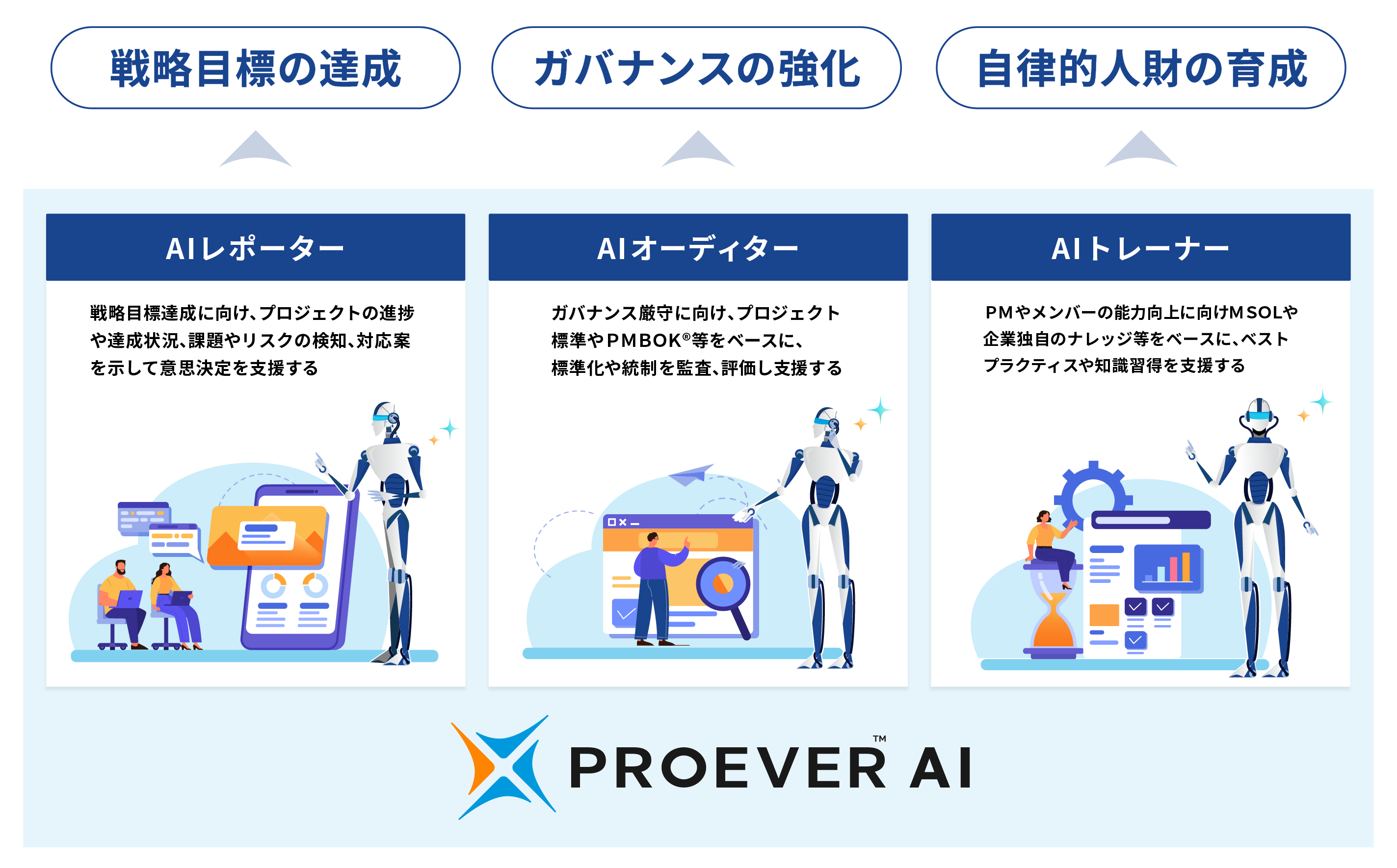 新バージョンでは、3種類の専門特化したAIエージェントを統合した「PROEVER AI」を搭載します。ユーザーとの双方向の協働プロセスを通じて、EPMOが直面する「戦略目標の達成」「ガバナンスの強化」「自律的人財の育成」という重要課題を解決へ導きます。