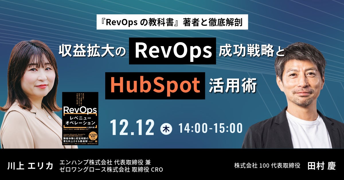 HubSpot Smart CRM™の導入・運用支援サービスを通じてRevOpsソリューションを提供する株式会社100(ハンドレッド、本社:東京都世田谷区、代表取締役:田村慶、以下、100)は、レベニュー組織の生産性向上や人材育成支援を行うと共催で、「RevOps(レベニューオペレーション)」をテーマとした無料オンラインウェビナーを2024年12月12日(木)に開催いたします。